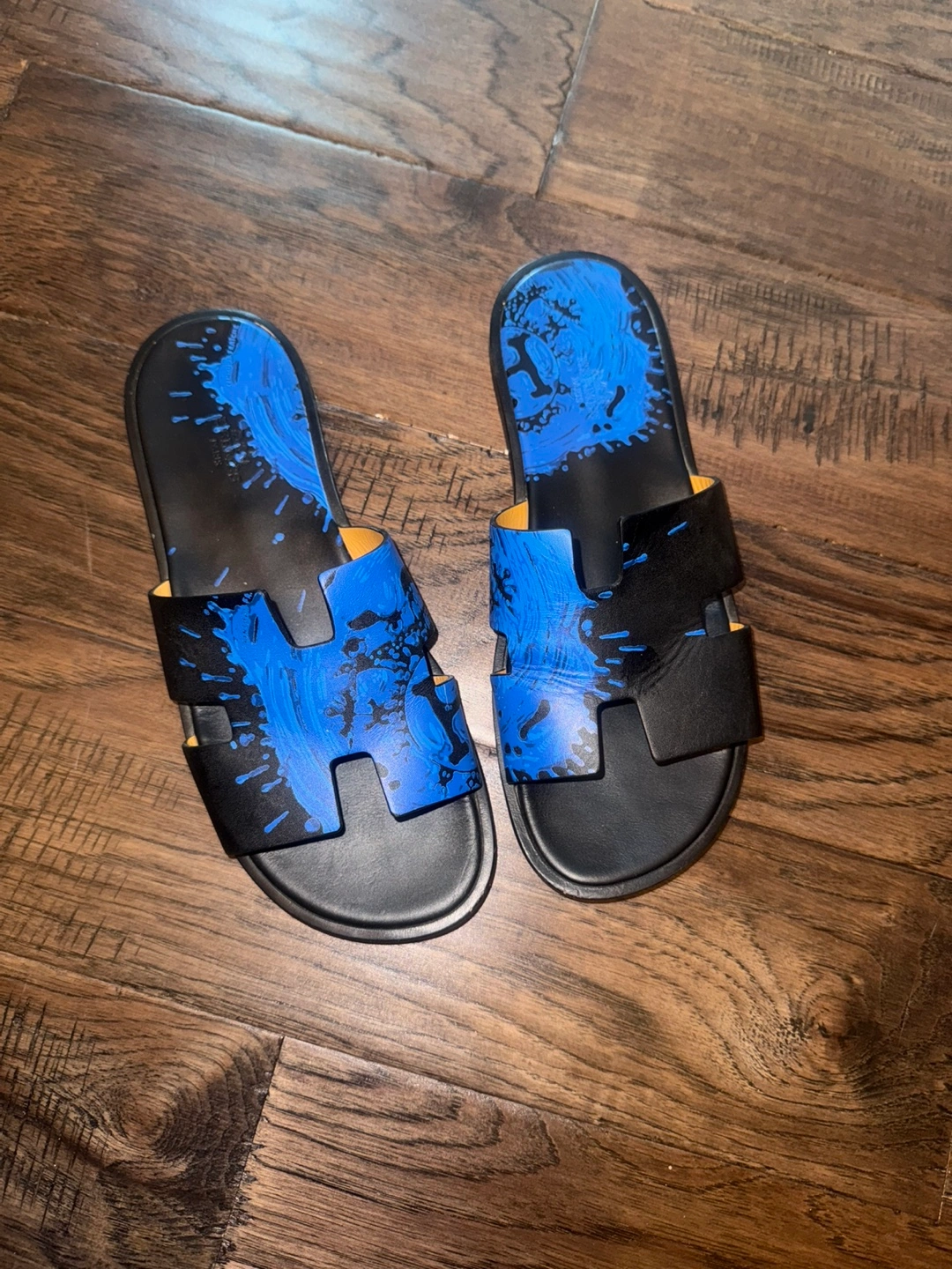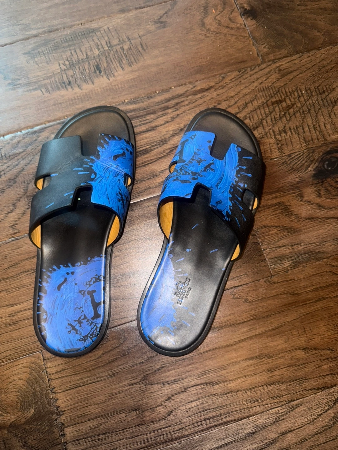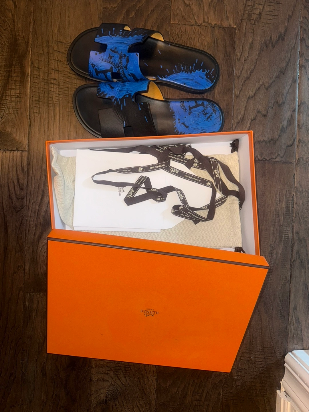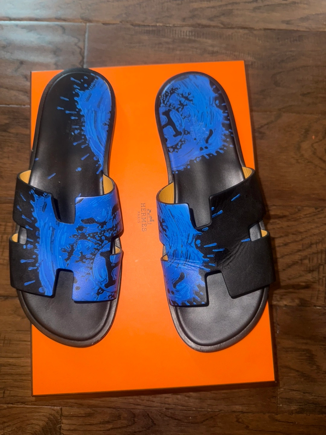 60Selling a pair of Hermès Izmir sandals in black and blue, size 42. They come with the original box and packaging. These stylish sandals are perfect for adding a touch of luxury to your everyday look!