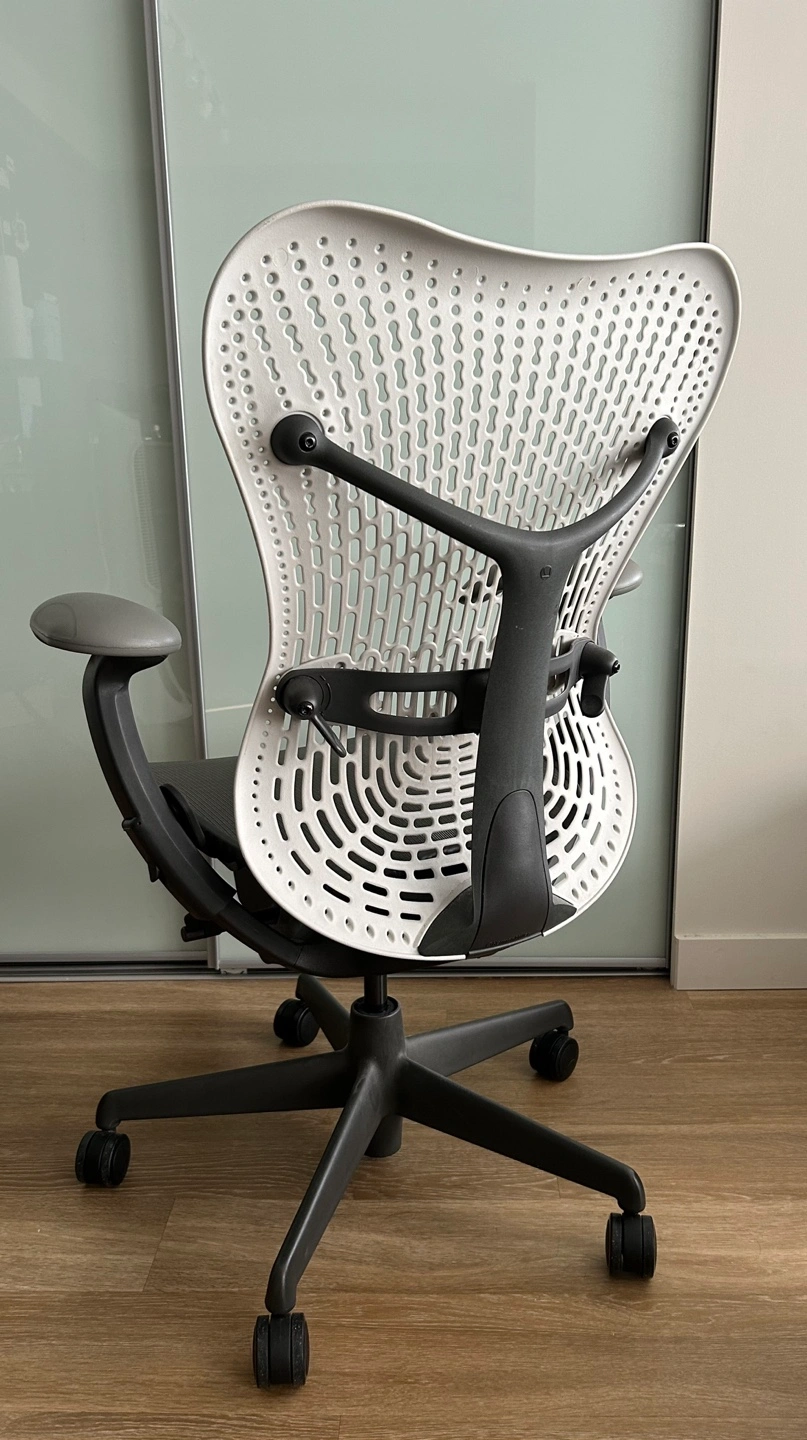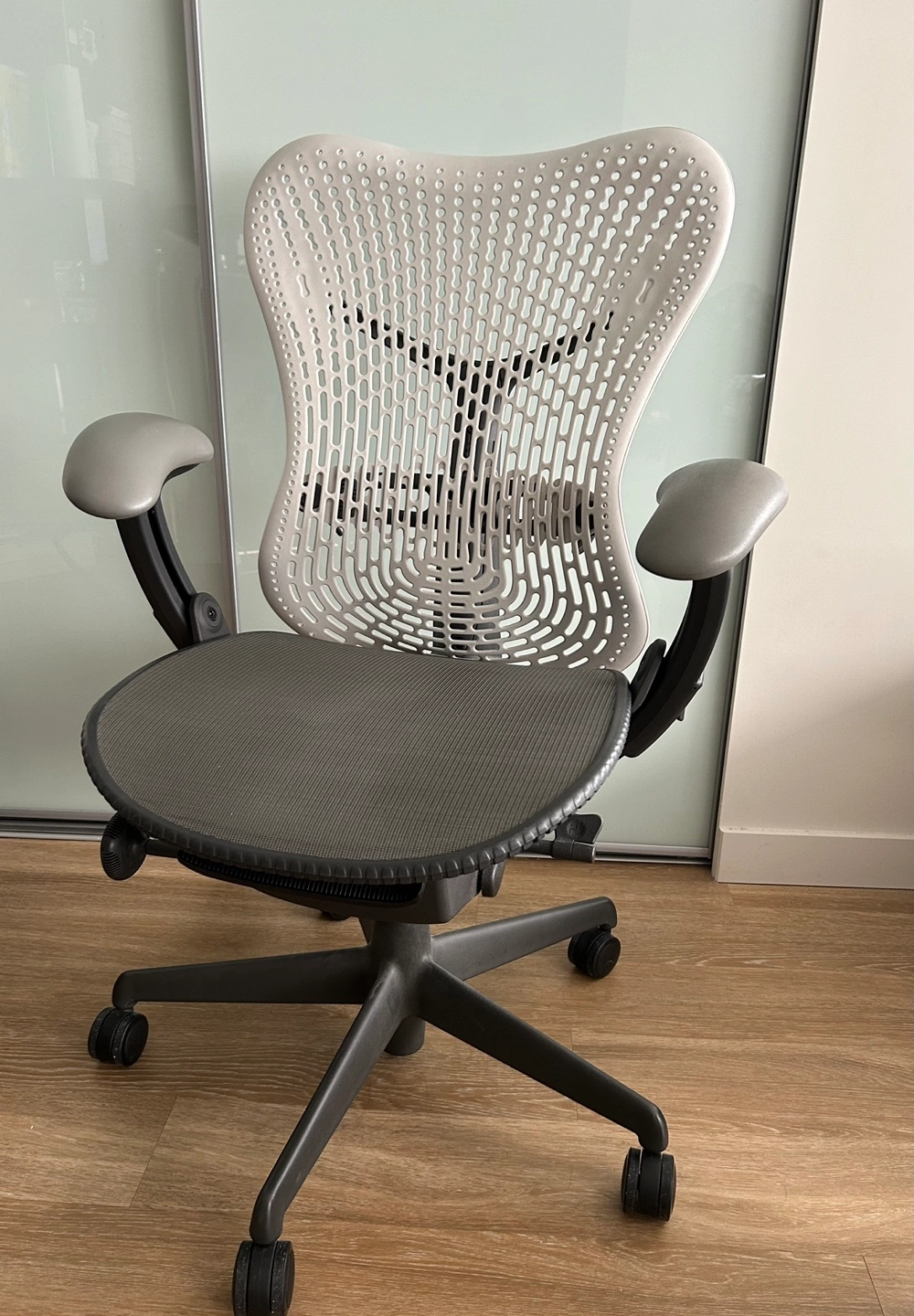 White mesh back and seat, grey fabric seat cushion. Adjustable arms and backrest. Pickup only - near Broadway City Hall