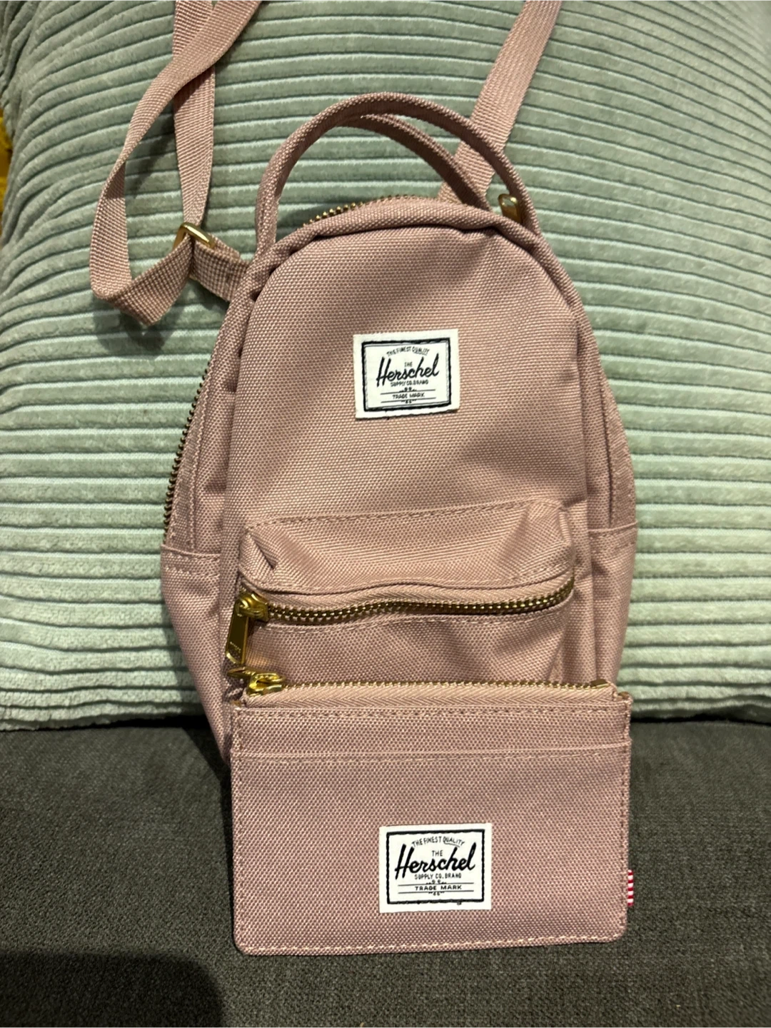 60Selling a cute Herschel cross body with a matching card holder! Both are in great condition. The mini backpack is a perfect size for carrying essentials, and the card holder is super handy for keeping your cards organized. Great for everyday use!