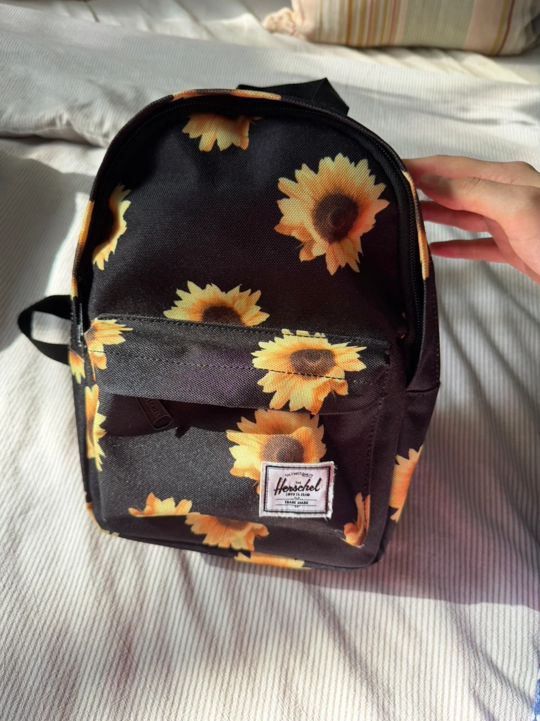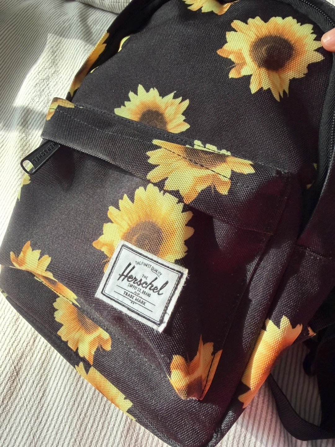27This Herschel backpack features a fun sunflower print on a black background. It's in great condition and has a red and white striped interior lining. Perfect for carrying your essentials around town! Dimensions 28cm (H) x 21cm (W) x 13cm (D)