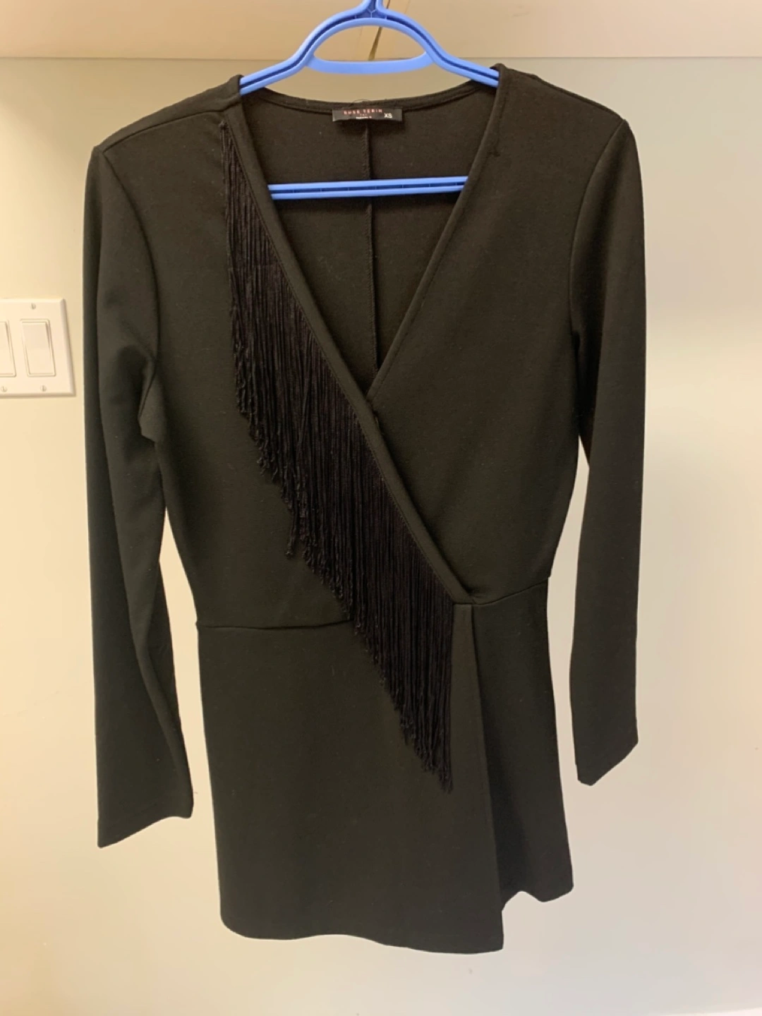 Long-sleeved black jumpsuit with a V-neck and a fringe detail on the front.