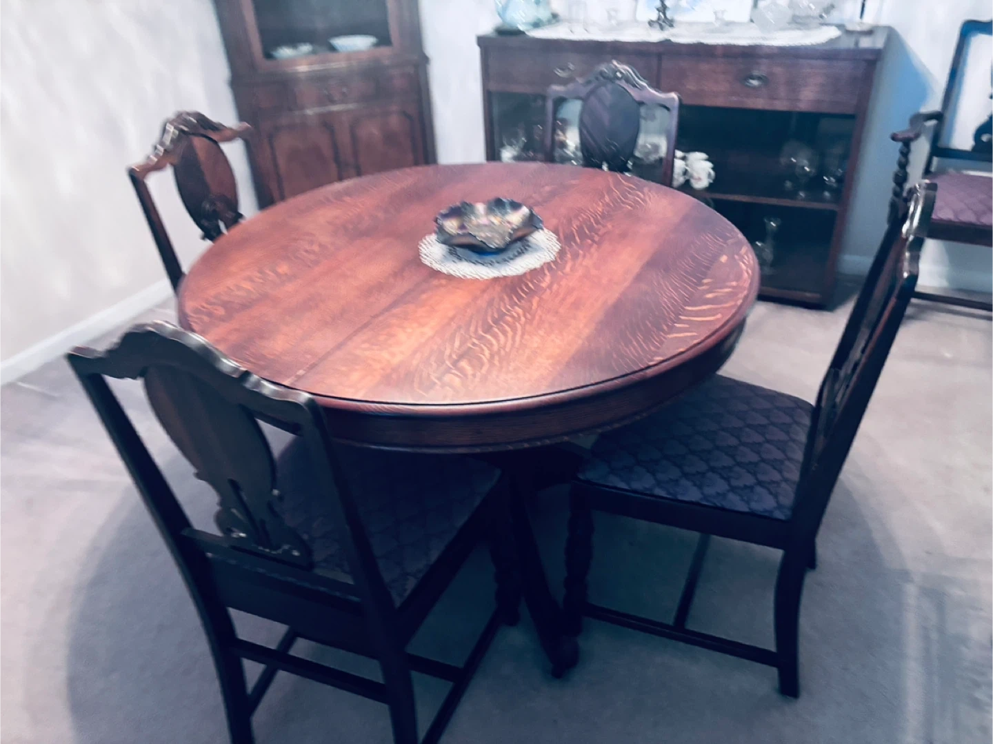 This is an antique dining set with 6 chairs with a dark wood frame and a patterned upholstered seat. It features ornate carvings on the backrest and turned legs. The style suggests it's a decorative accent piece.