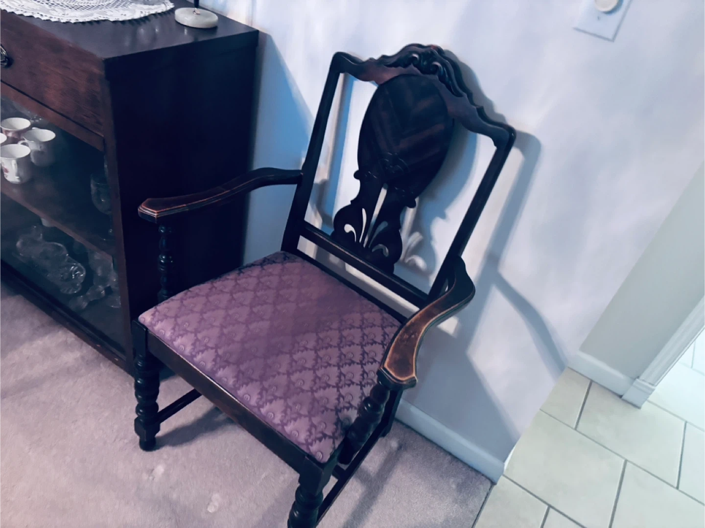 This is an antique dining set with 6 chairs with a dark wood frame and a patterned upholstered seat. It features ornate carvings on the backrest and turned legs. The style suggests it's a decorative accent piece.