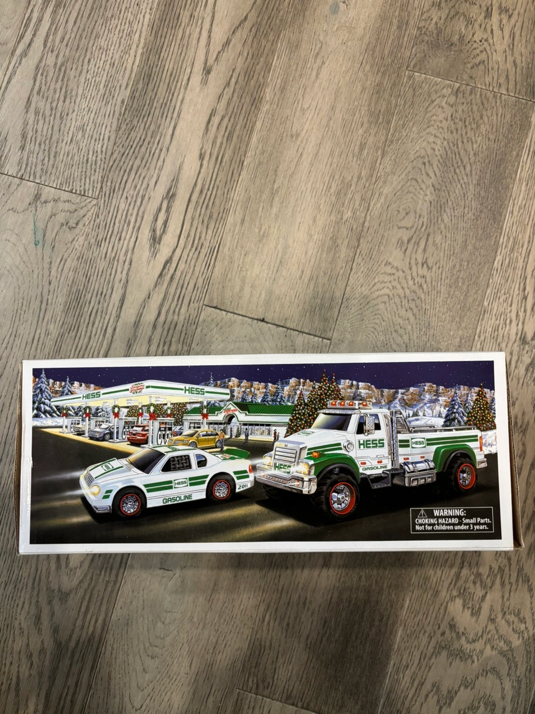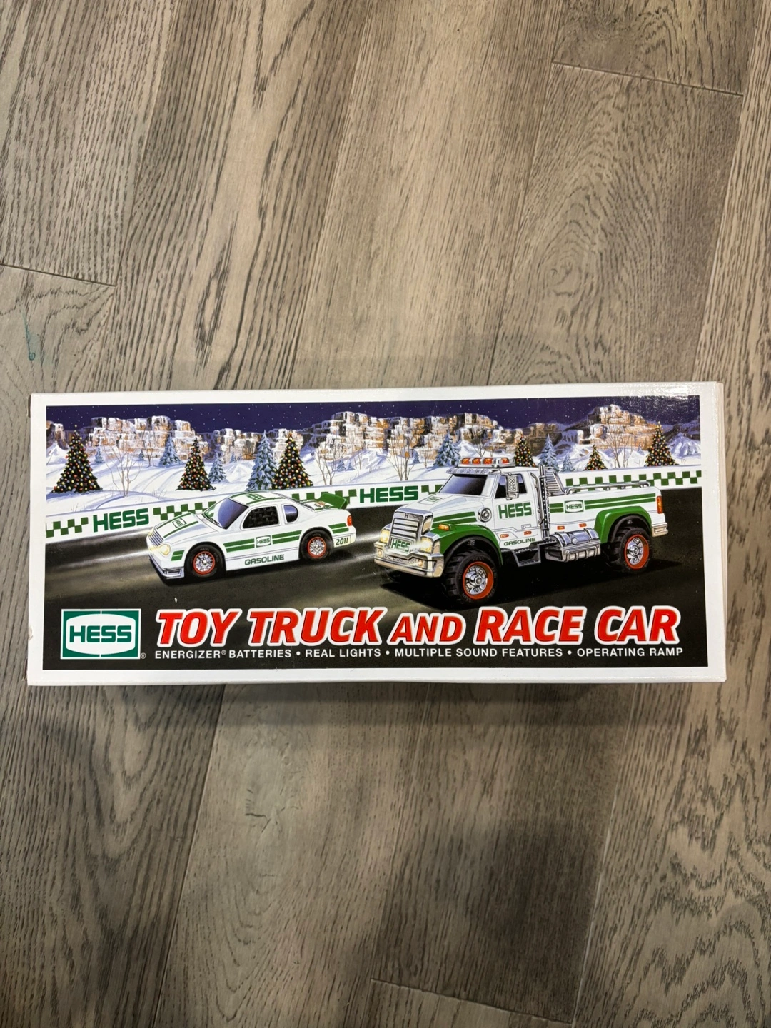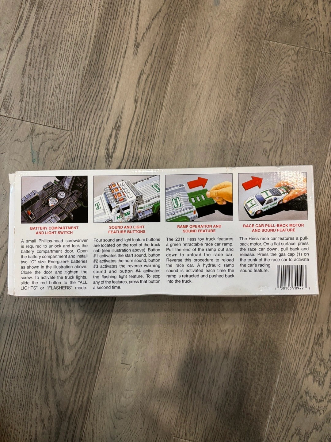 Selling a brand new, in-box Hess Toy Truck and Race Car! This set features real lights, multiple sound features, and an operating ramp. It requires a small Phillips-head screwdriver and two 'C' size Energizer batteries (not included) to operate the battery compartment door. There are four sound and light feature buttons located on the roof of the truck cab. The 2011 Hess truck features a green retractable race car ramp. The Hess race car features a pull-back motor and sound feature