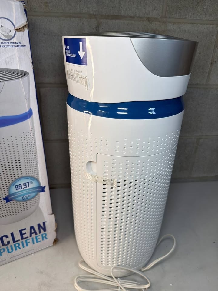 Compact 360° air purifier designed for medium rooms up to 195 sq. ft. The HEPA-type filter captures up to 99% of airborne allergens down to 0.3 microns, while the activated carbon layer reduces odors and VOCs. Features three fan speeds, an optional ionizer, built-in timer, and a soft night-light. Includes essential oil pads for added fragrance and comes with a complete filter set for immediate use.