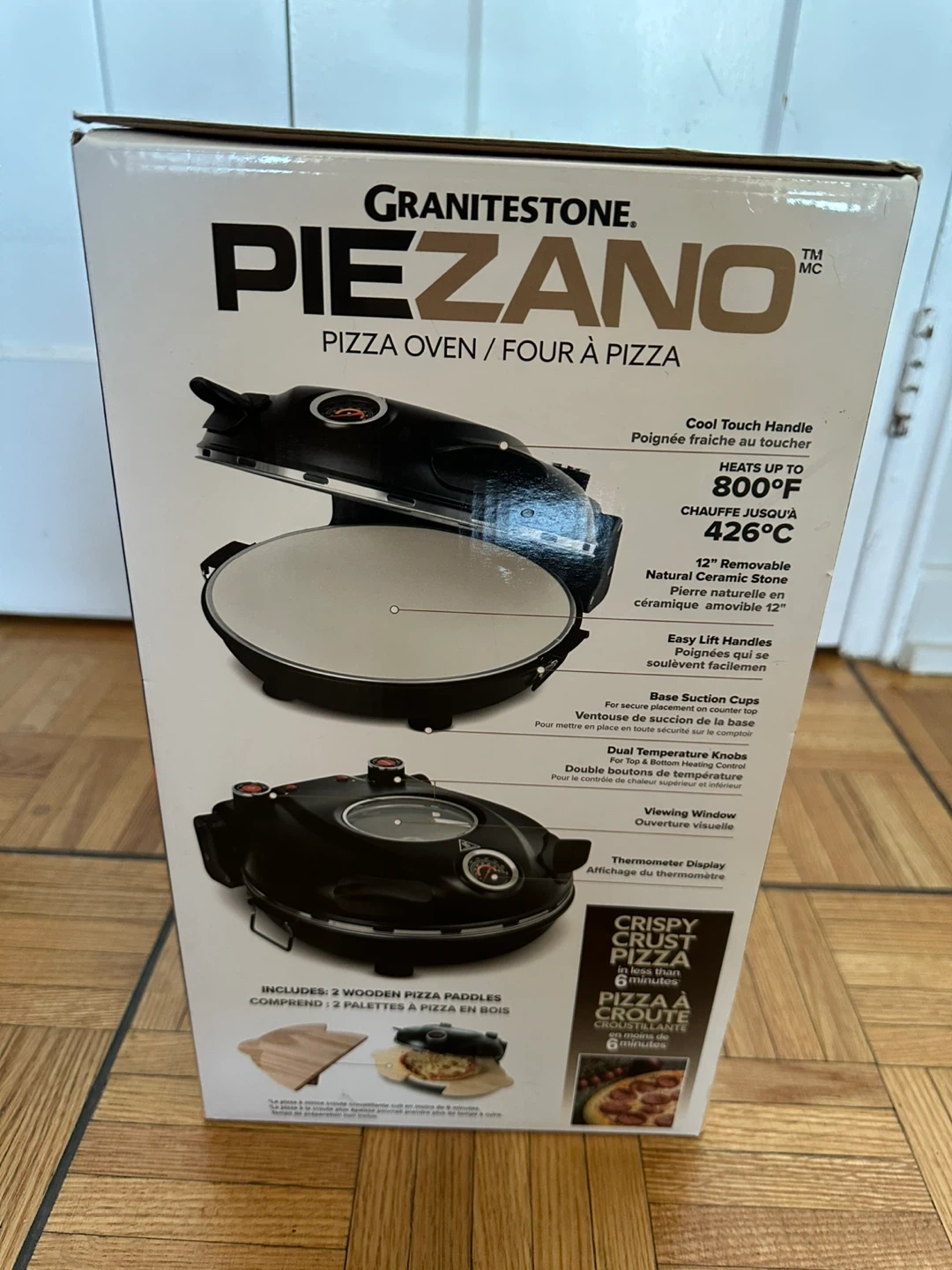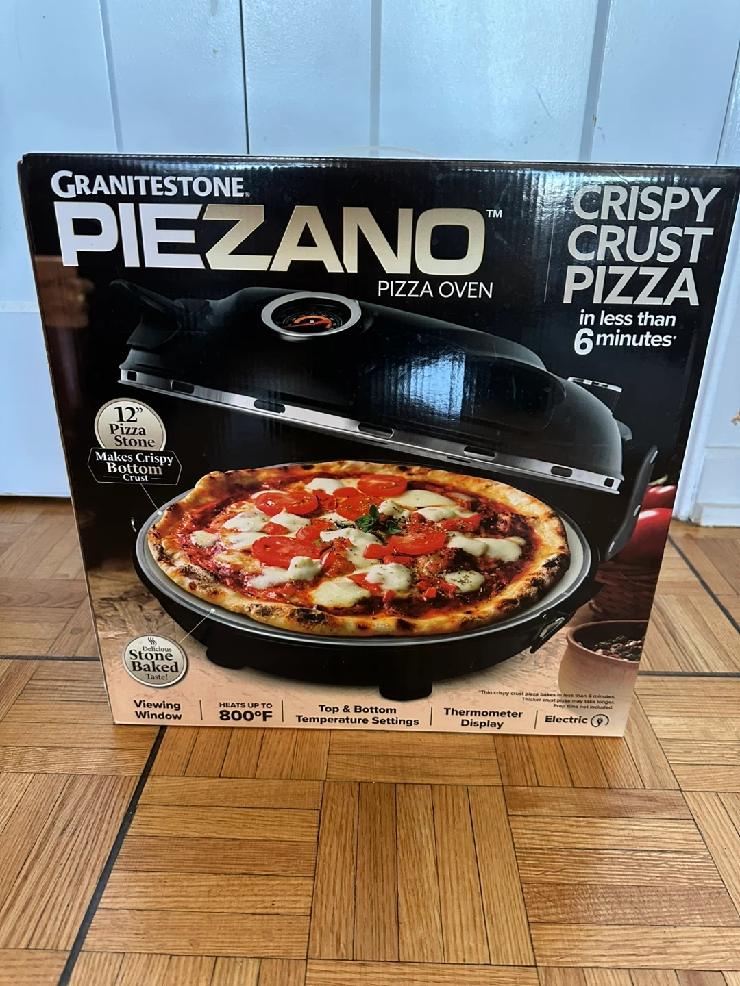 This electric pizza oven heats up to 800°F and includes a 12" removable pizza stone. It comes with 3 wooden pizza paddles. Makes crispy crust pizza in less than 6 minutes!