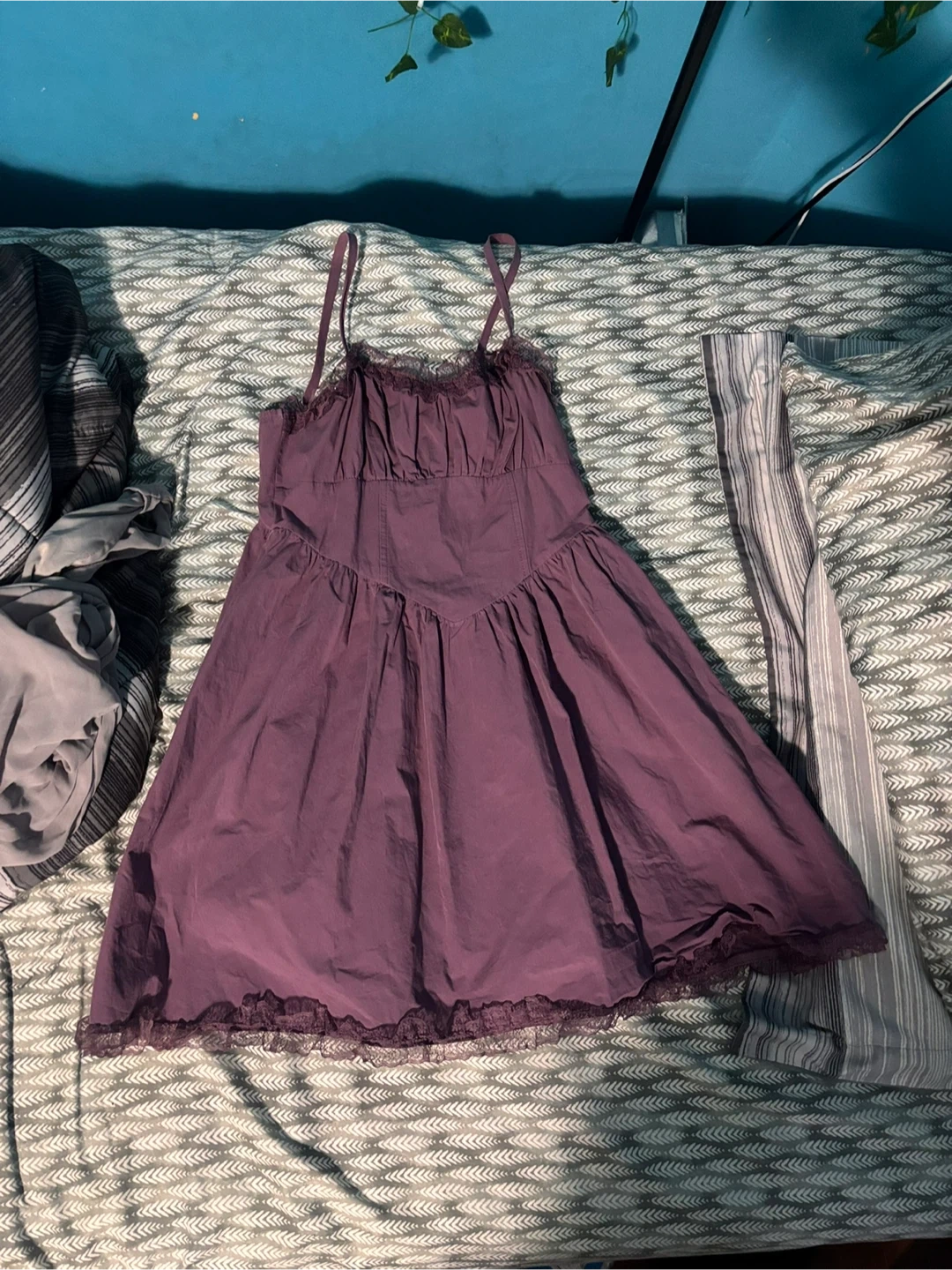 This is a cute purple babydoll dress. It has adjustable spaghetti straps and delicate lace trim along the neckline and hem.