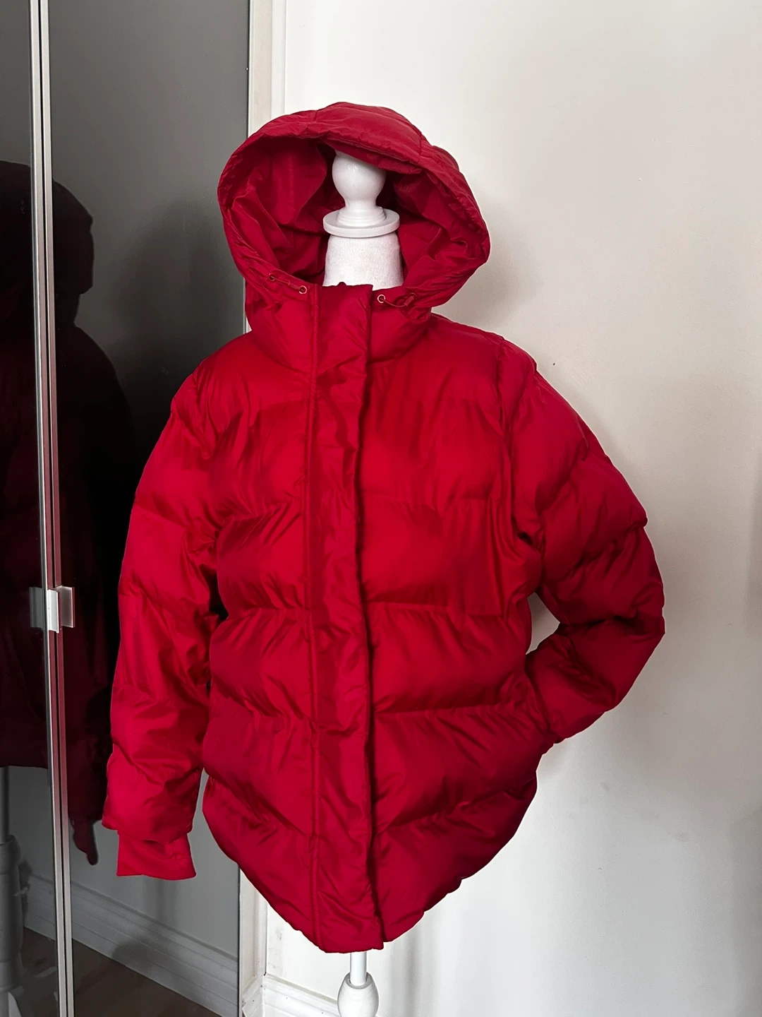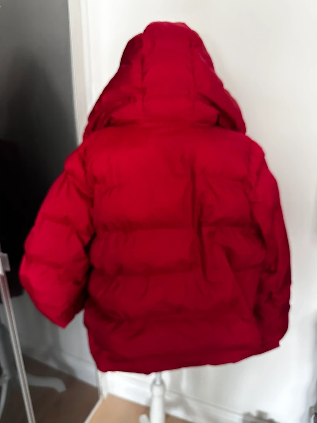 Cozy red puffer jacket with a hood. It's fully lined with a zip and snap closure. Side pockets included for convenience. This jacket is great for chilly weather!