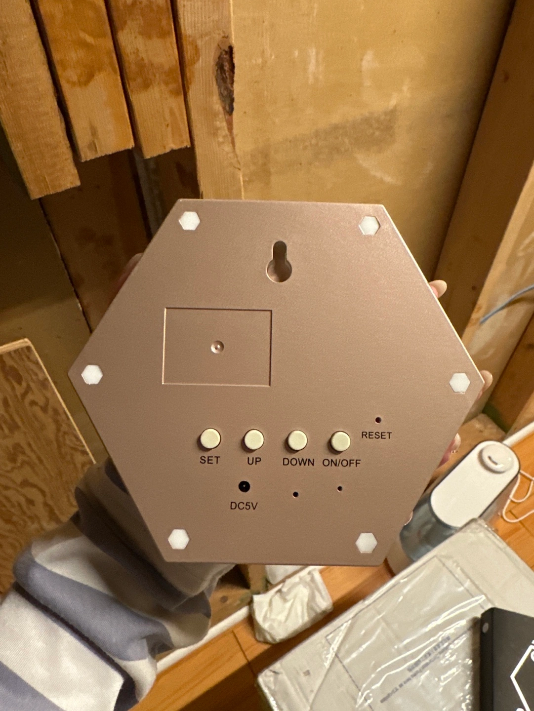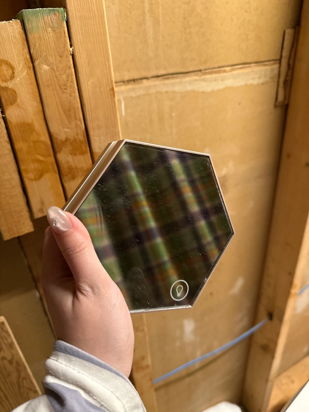 Rose gold hexagon shaped LED mirror. Features adjustable brightness and on/off switch. Battery operated. Compact and portable.