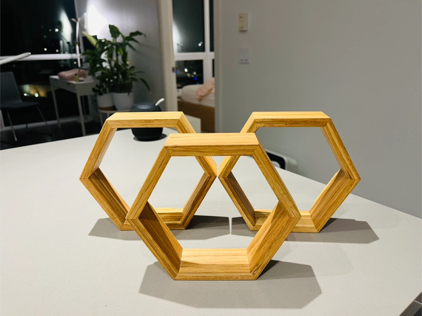 56Here's a set of three hexagon-shaped wall shelves, perfect for adding a touch of modern design to any room. They're made of light-coloured wood and are in new condition. They're ready to be mounted with adhesive strips already attached, making installation a breeze