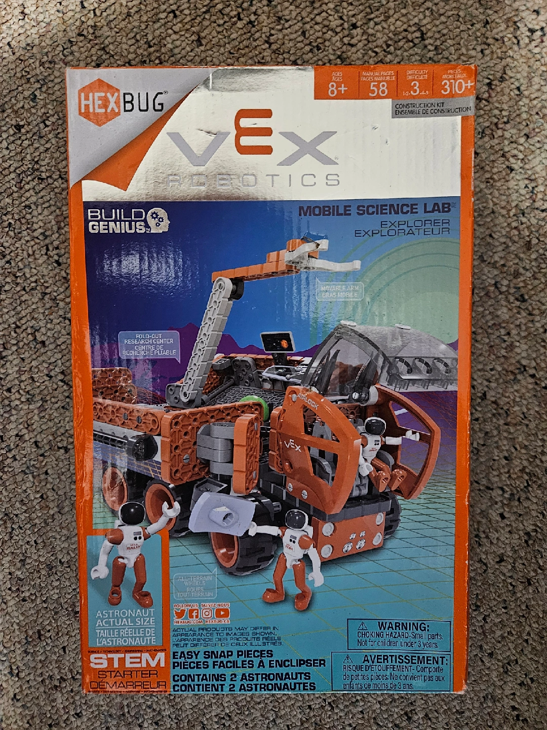 Get ready to build and explore with the HEXBUG VEX Robotics Mobile Science Lab Explorer! This construction kit is perfect for ages 8+. It includes 310+ pieces and contains 2 astronauts. The kit features easy snap pieces and a fold-out research center. It also has all-terrain wheels and a movable arm for exploring any terrain