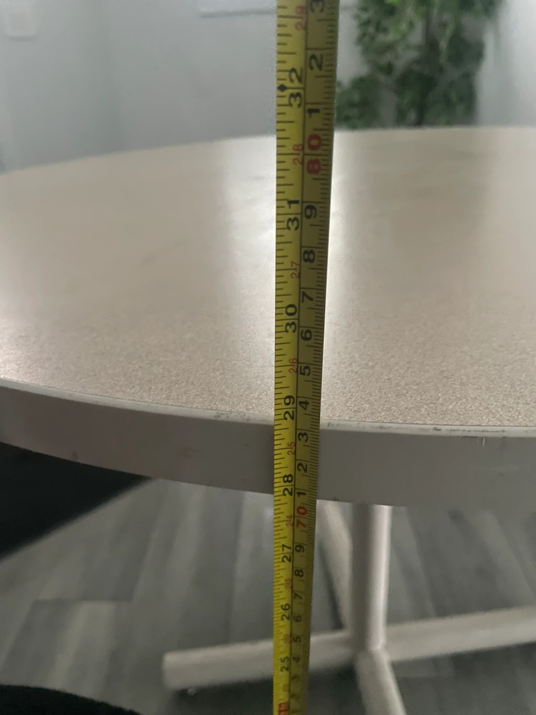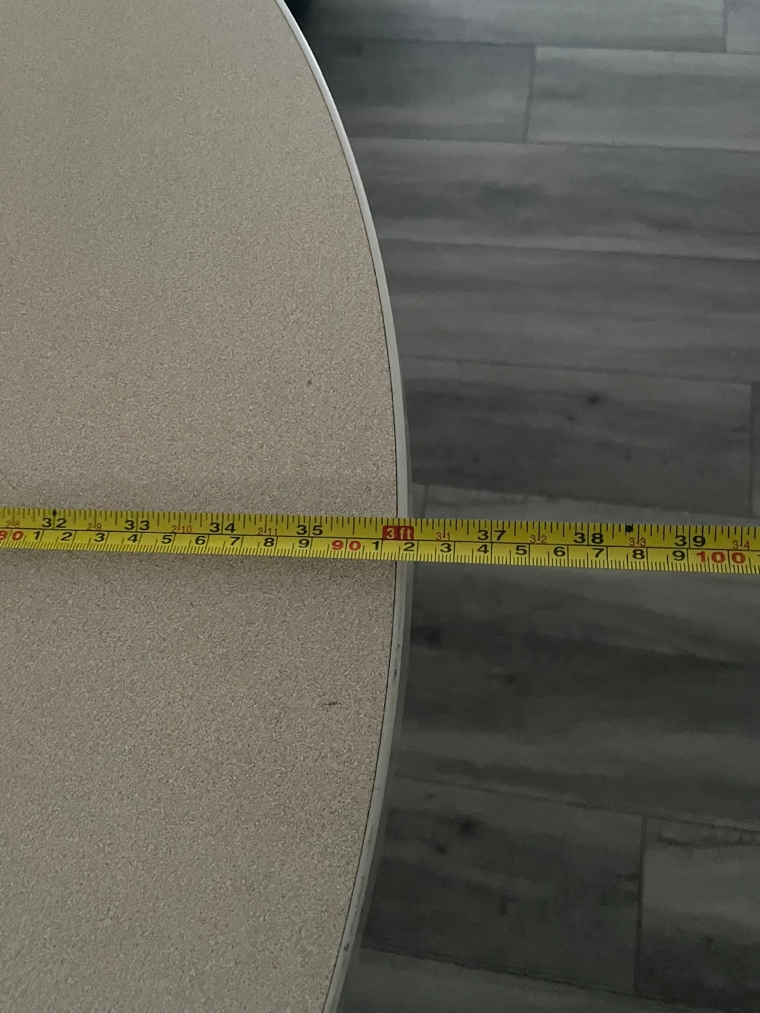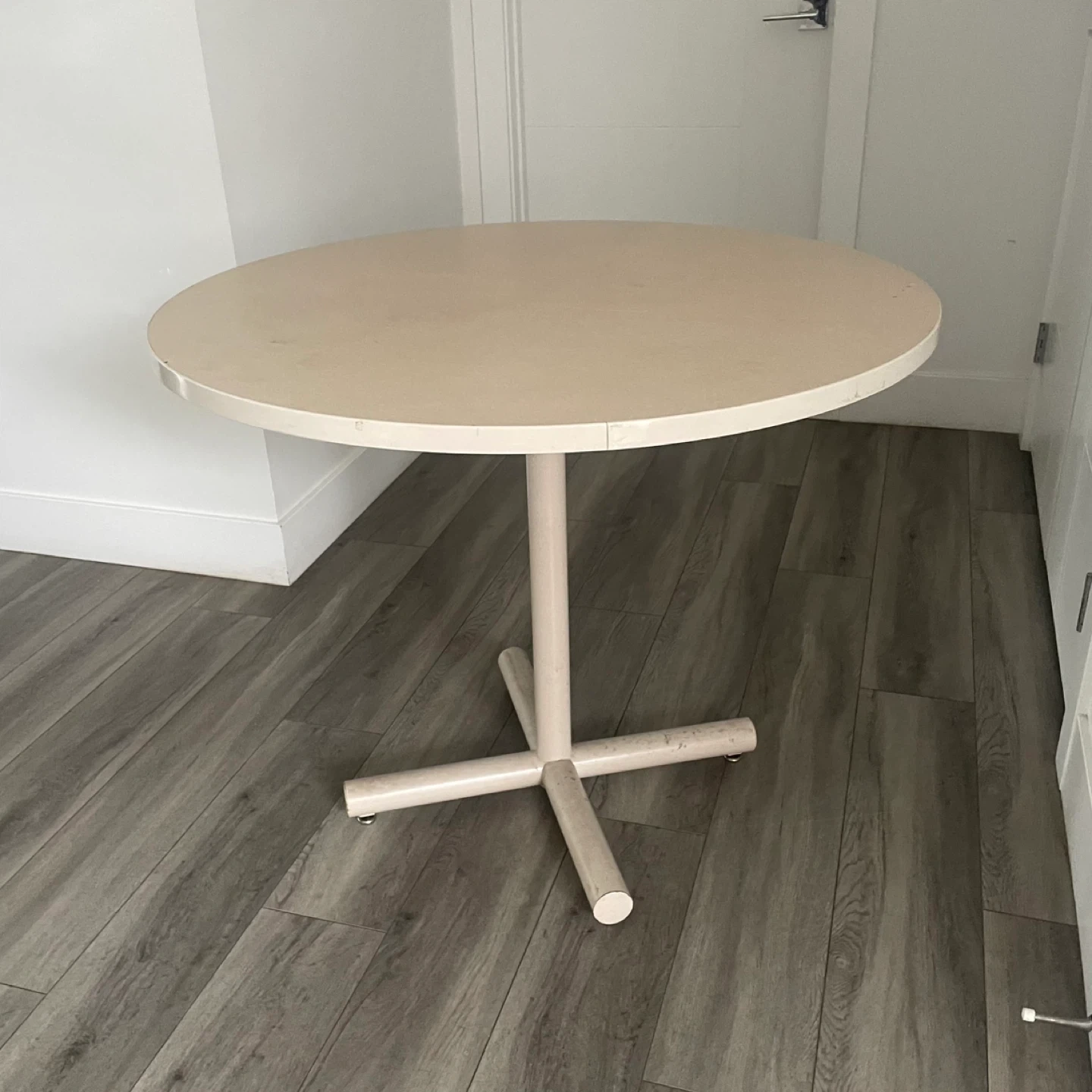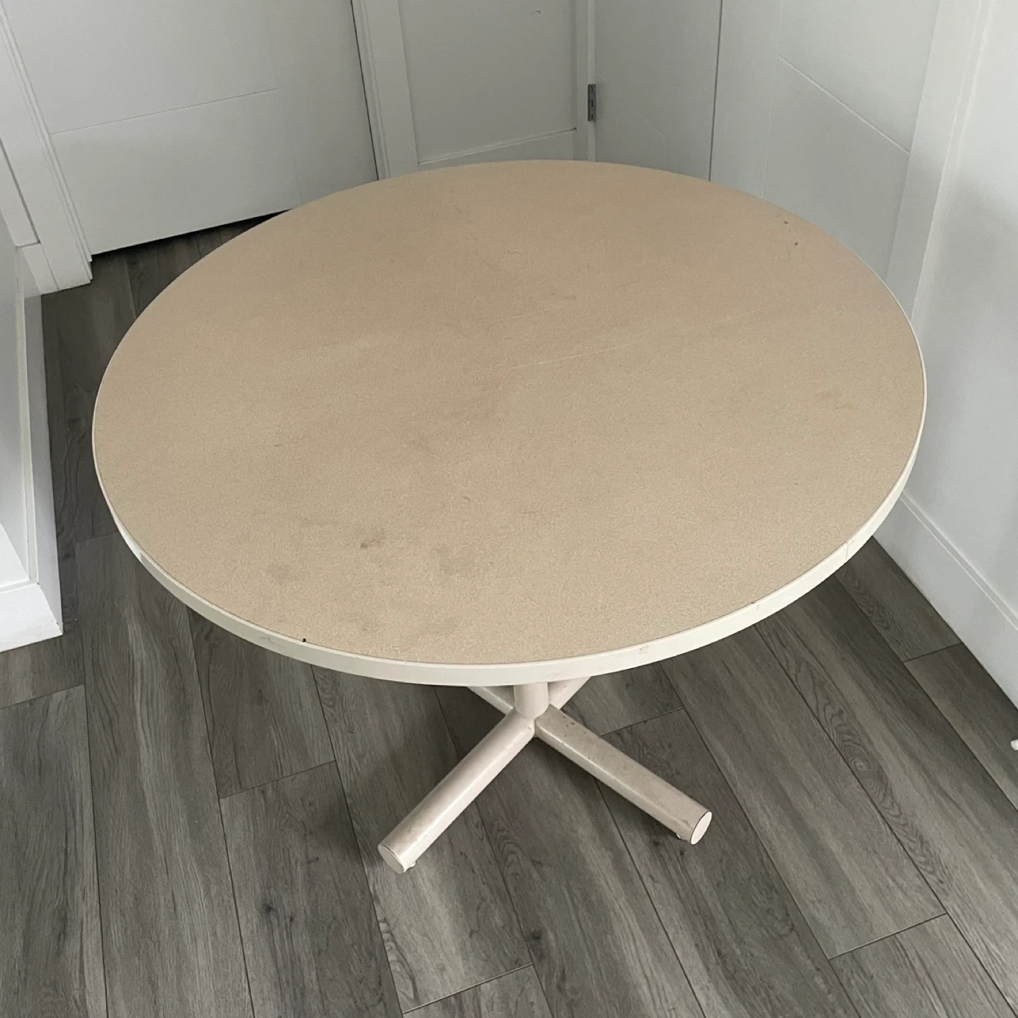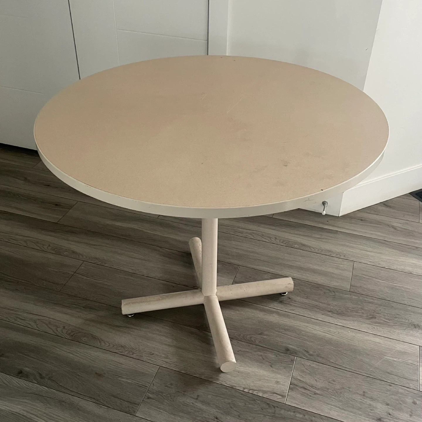 Round Beige Table. It's Has A Sturdy Base & A Smooth Top. It's In Good Condition & Perfect For A Small Dining Area or Cozy Nook.
