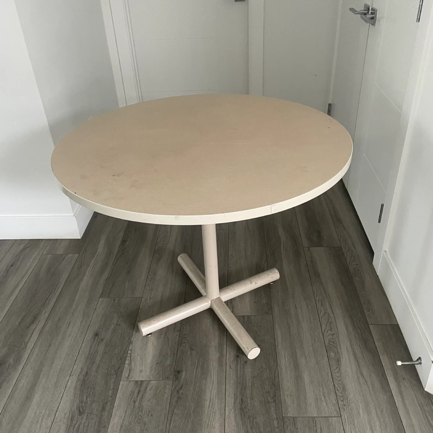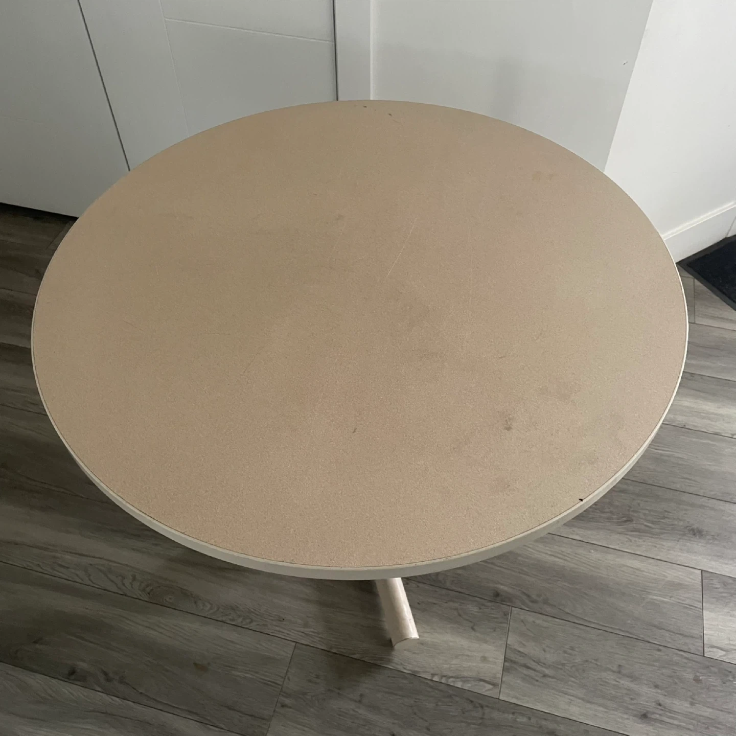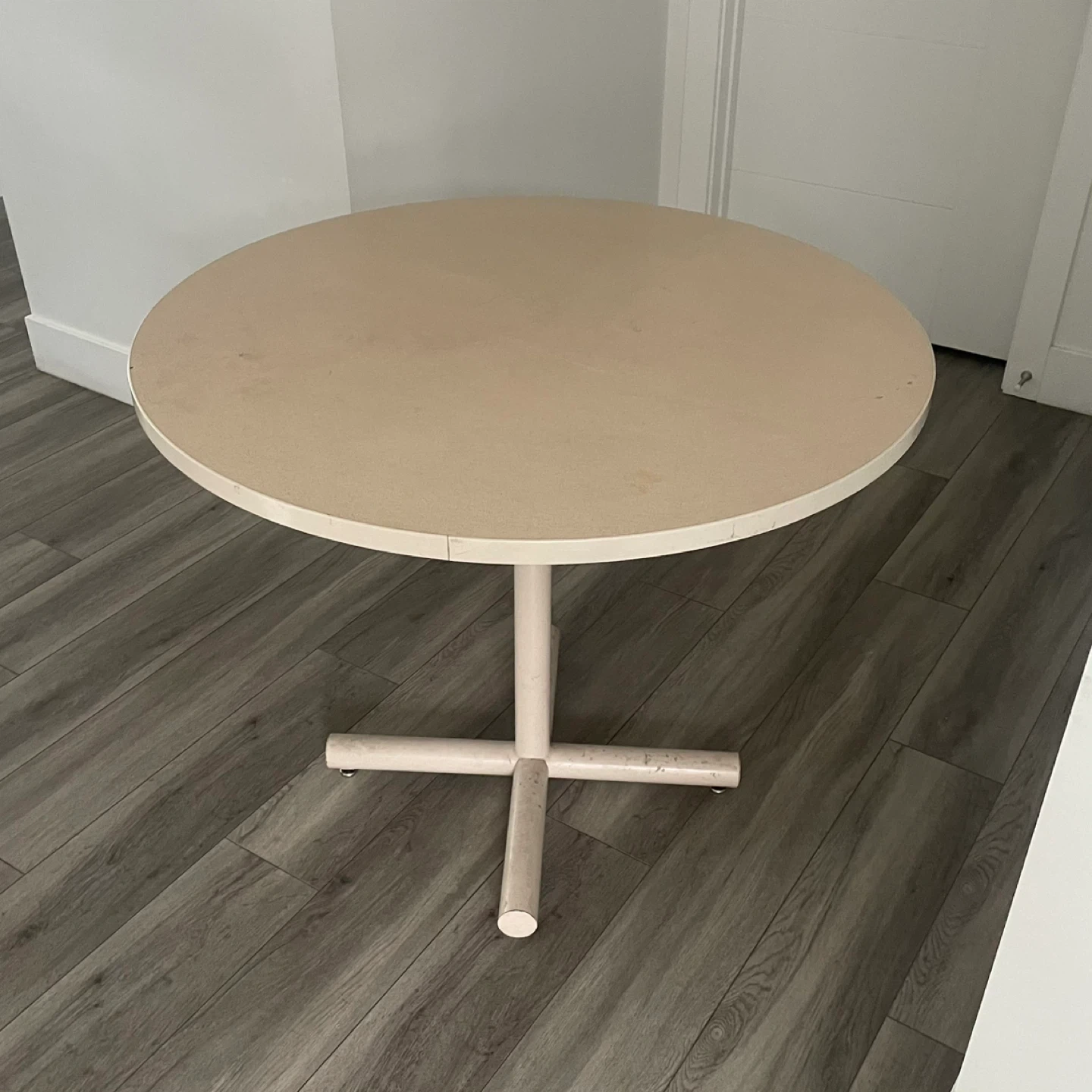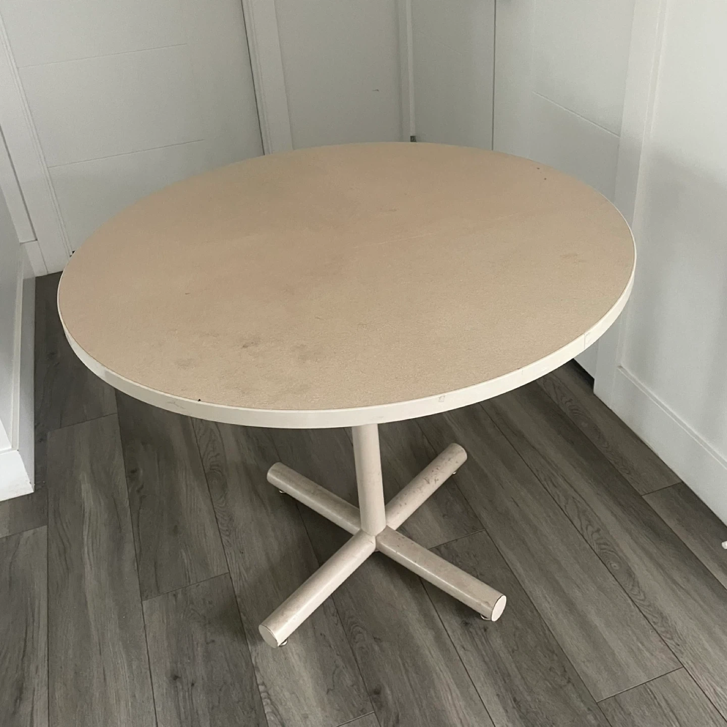 Round Beige Table. It's Has A Sturdy Base & A Smooth Top. It's In Good Condition & Perfect For A Small Dining Area or Cozy Nook.
