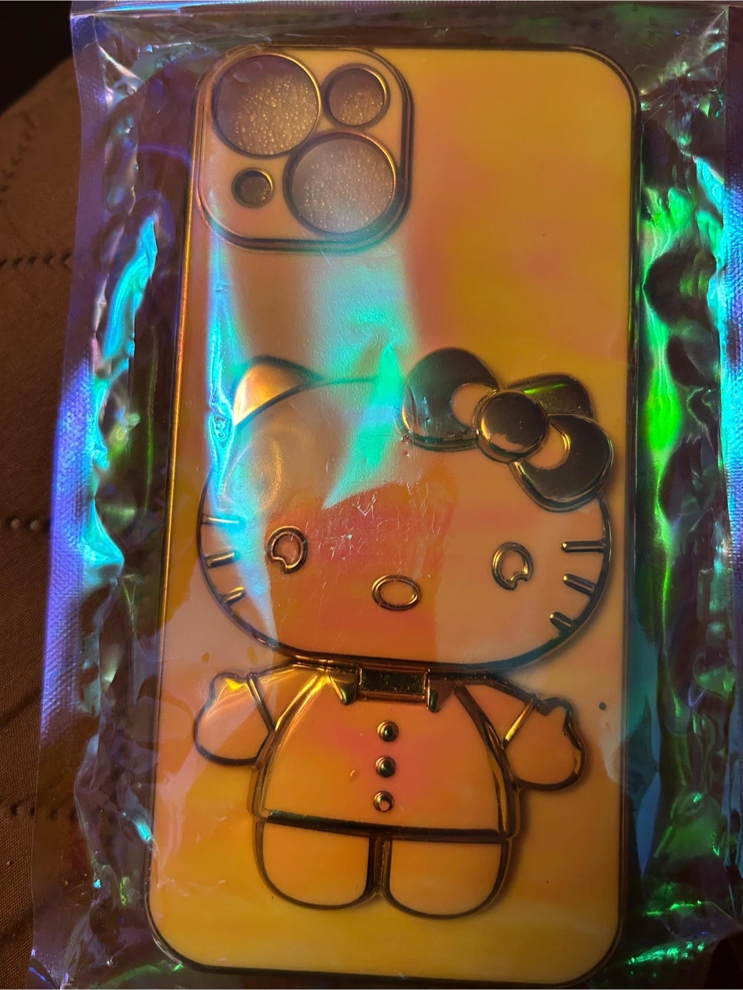 Iridescent phone case featuring Hello Kitty. It's a cute and eye-catching accessory for your phone. Includes a pink butterfly embellishment on the back. 20$ each