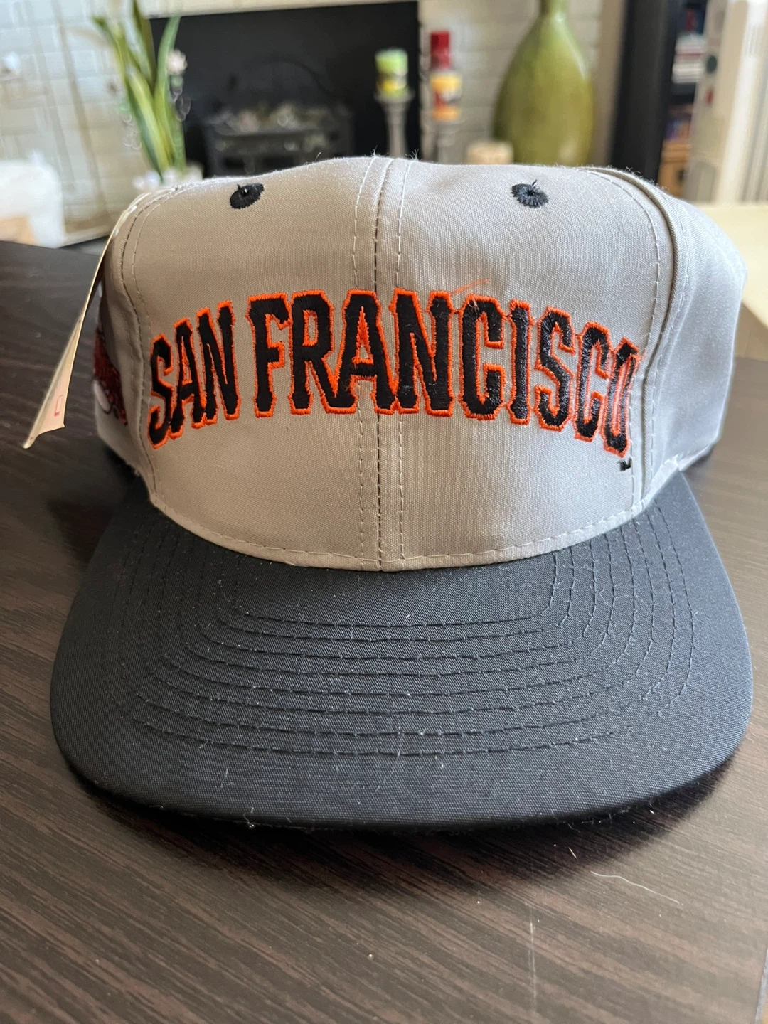 Selling a San Francisco baseball cap. It's grey with a black brim and adjustable strap at the back. It is genuine merchandise officially licensed by Major League Baseball.