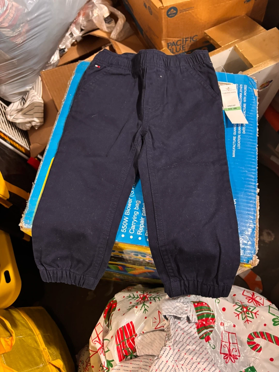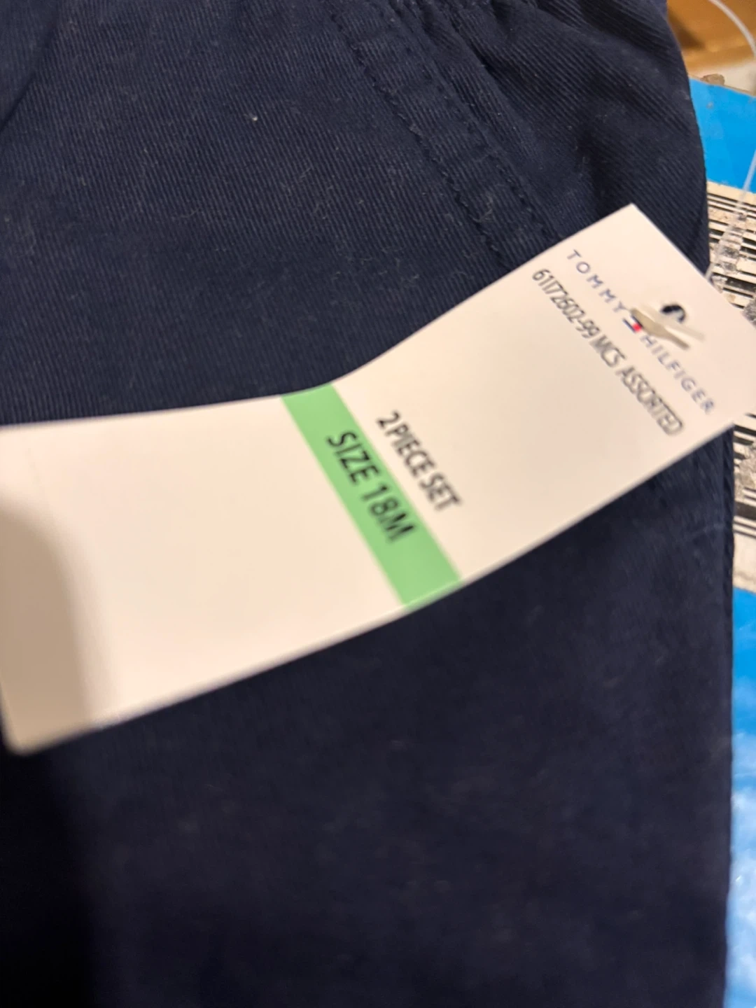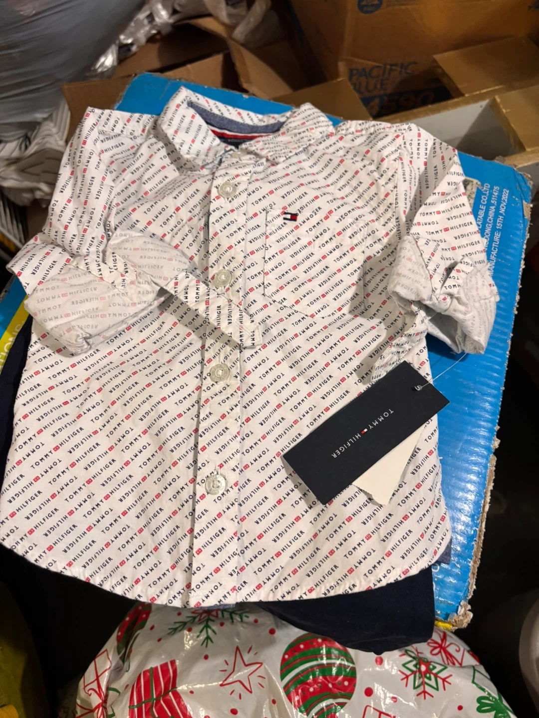 This Tommy Hilfiger boys' 2-piece set includes a white button-up shirt with an all-over logo print and navy blue pants. The shirt has a classic collar and button closure. The pants feature an elastic waistband and cuffed ankles. It's a size 18M.