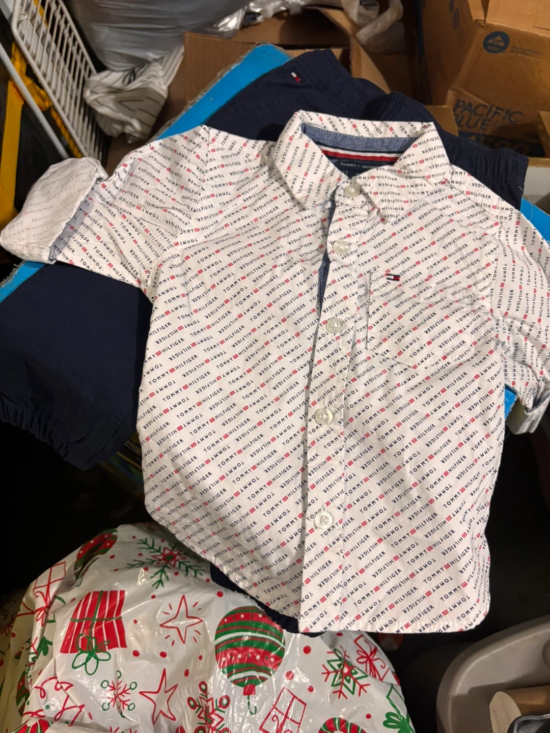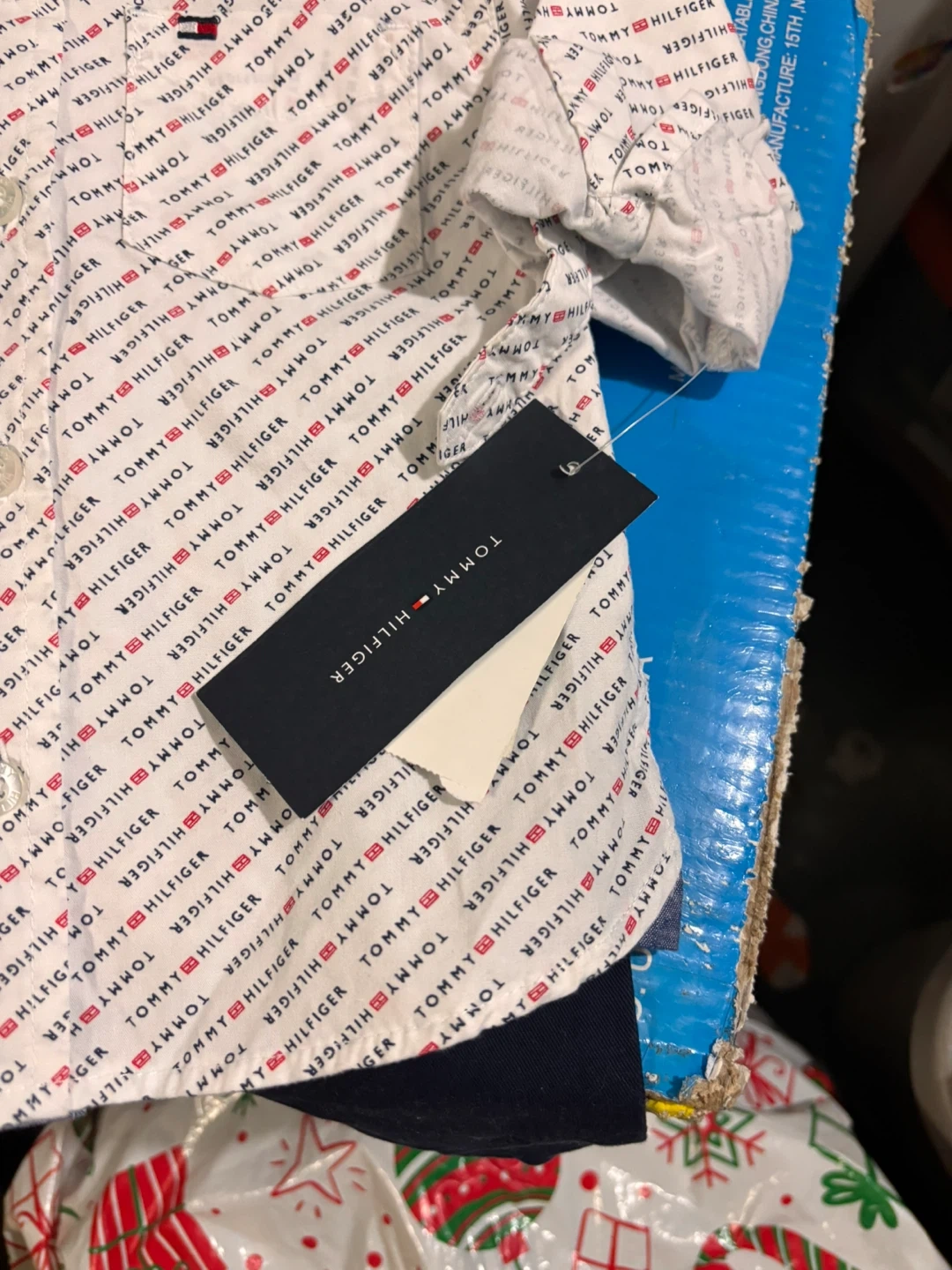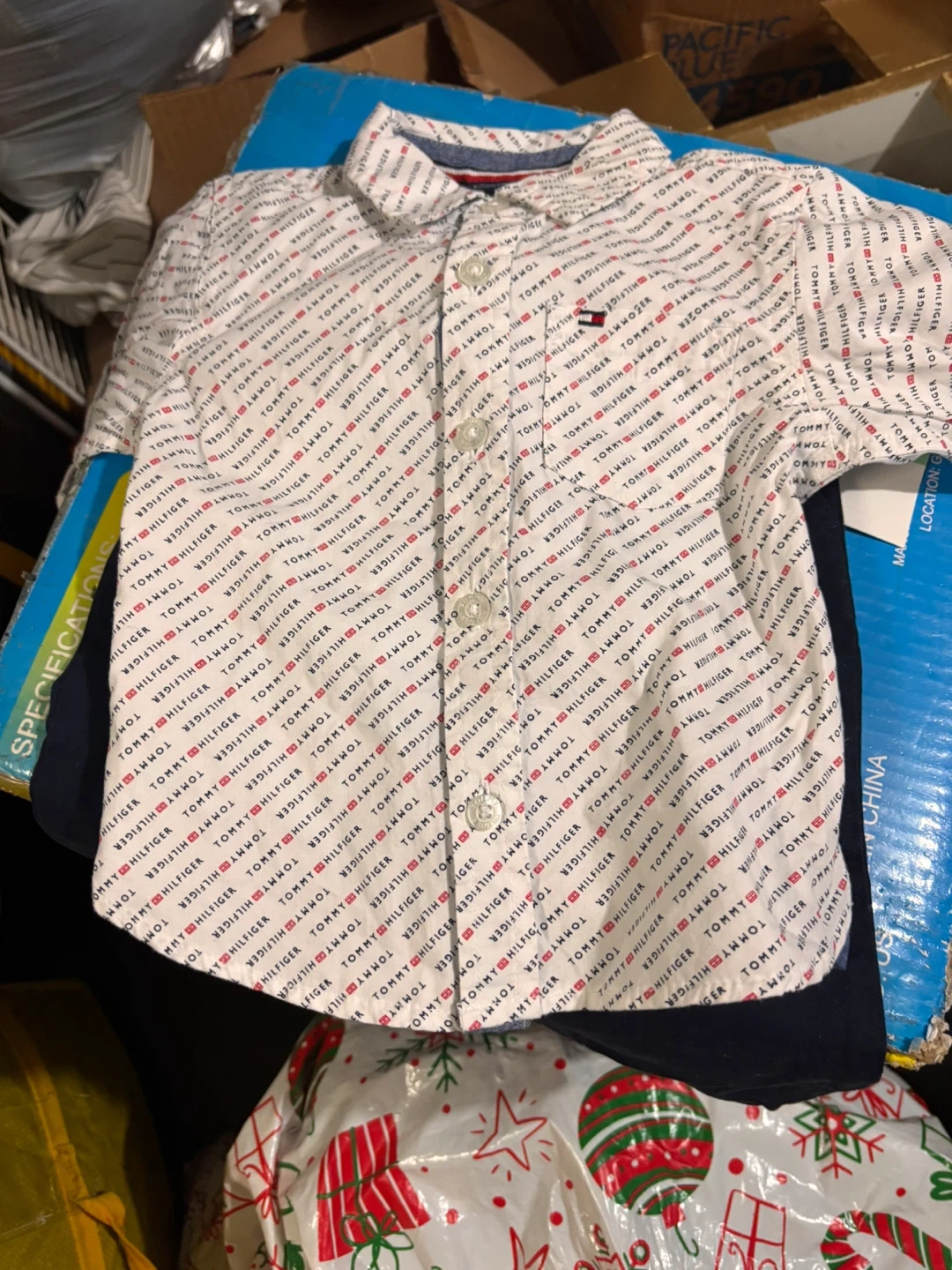 This Tommy Hilfiger boys' 2-piece set includes a white button-up shirt with an all-over logo print and navy blue pants. The shirt has a classic collar and button closure. The pants feature an elastic waistband and cuffed ankles. It's a size 18M.