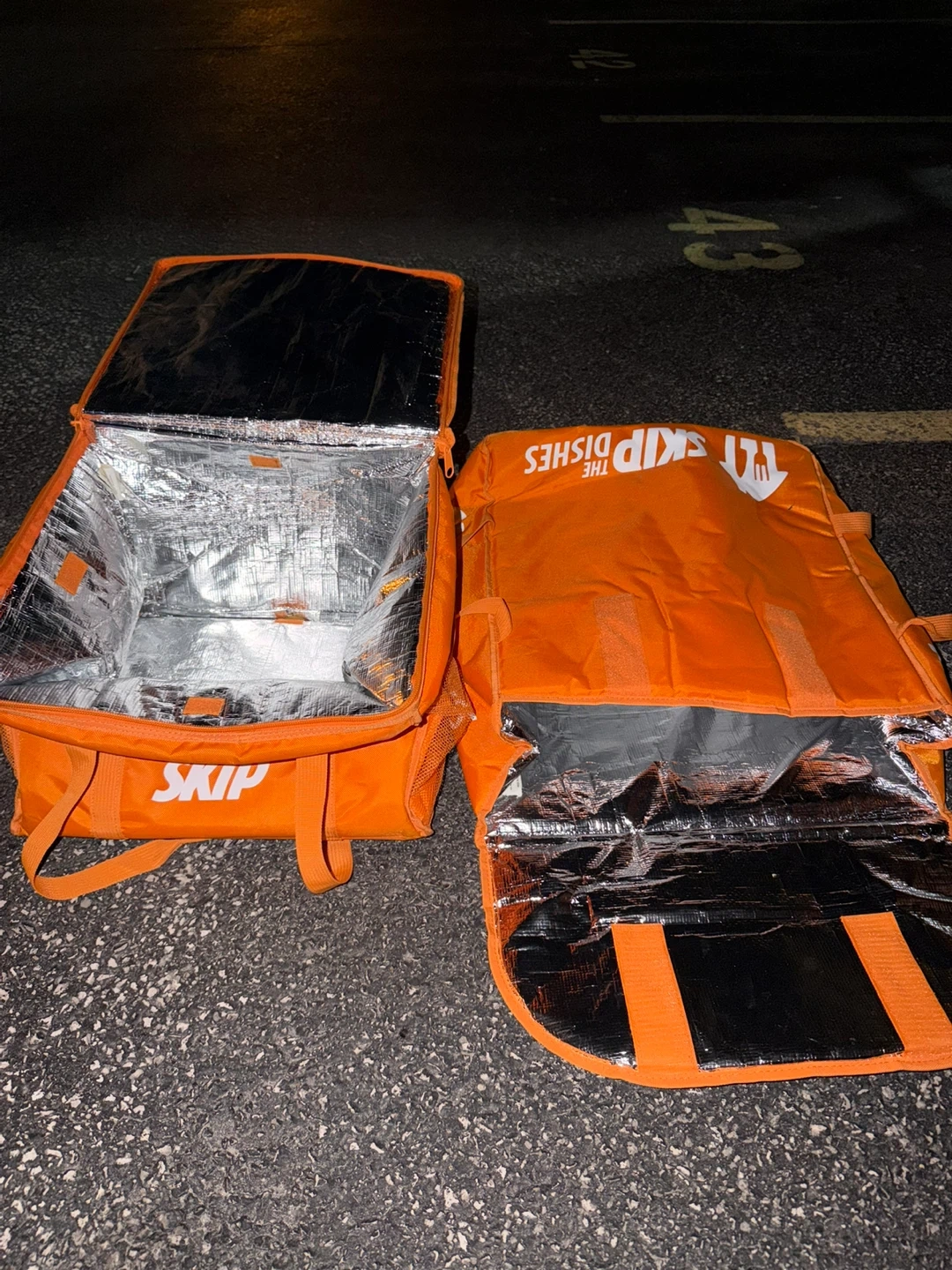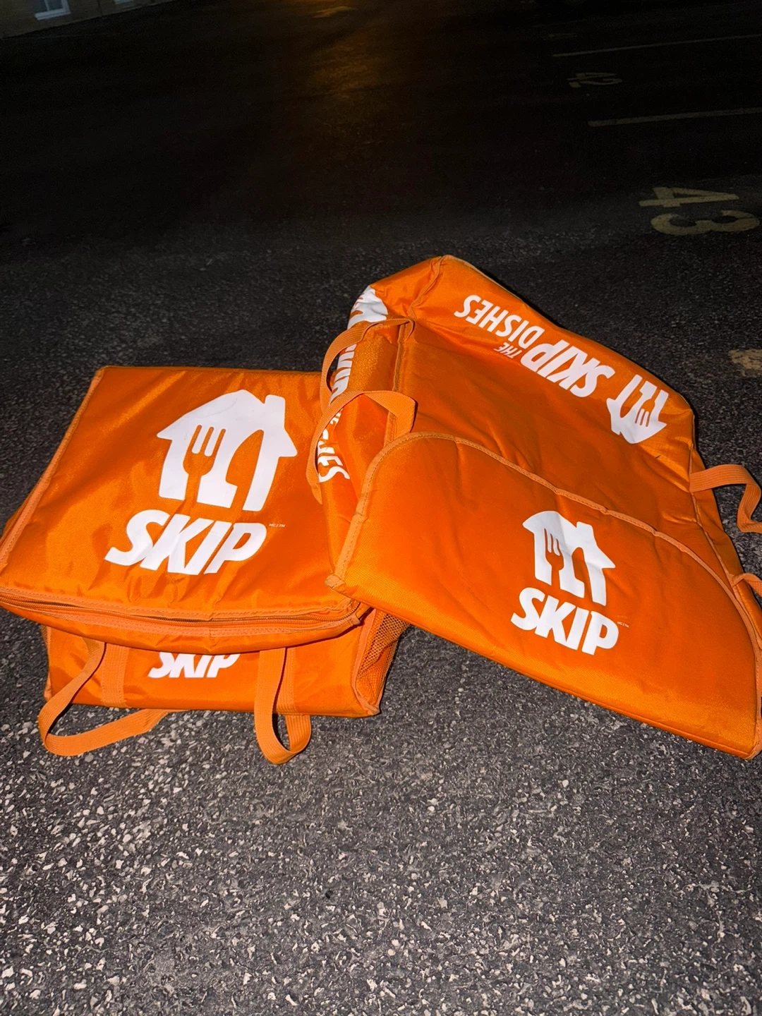 Two orange insulated delivery bags from SkipTheDishes. These bags are designed to keep food warm during deliveries. They're durable and have top handles for easy carrying. These are essential for any food delivery driver!