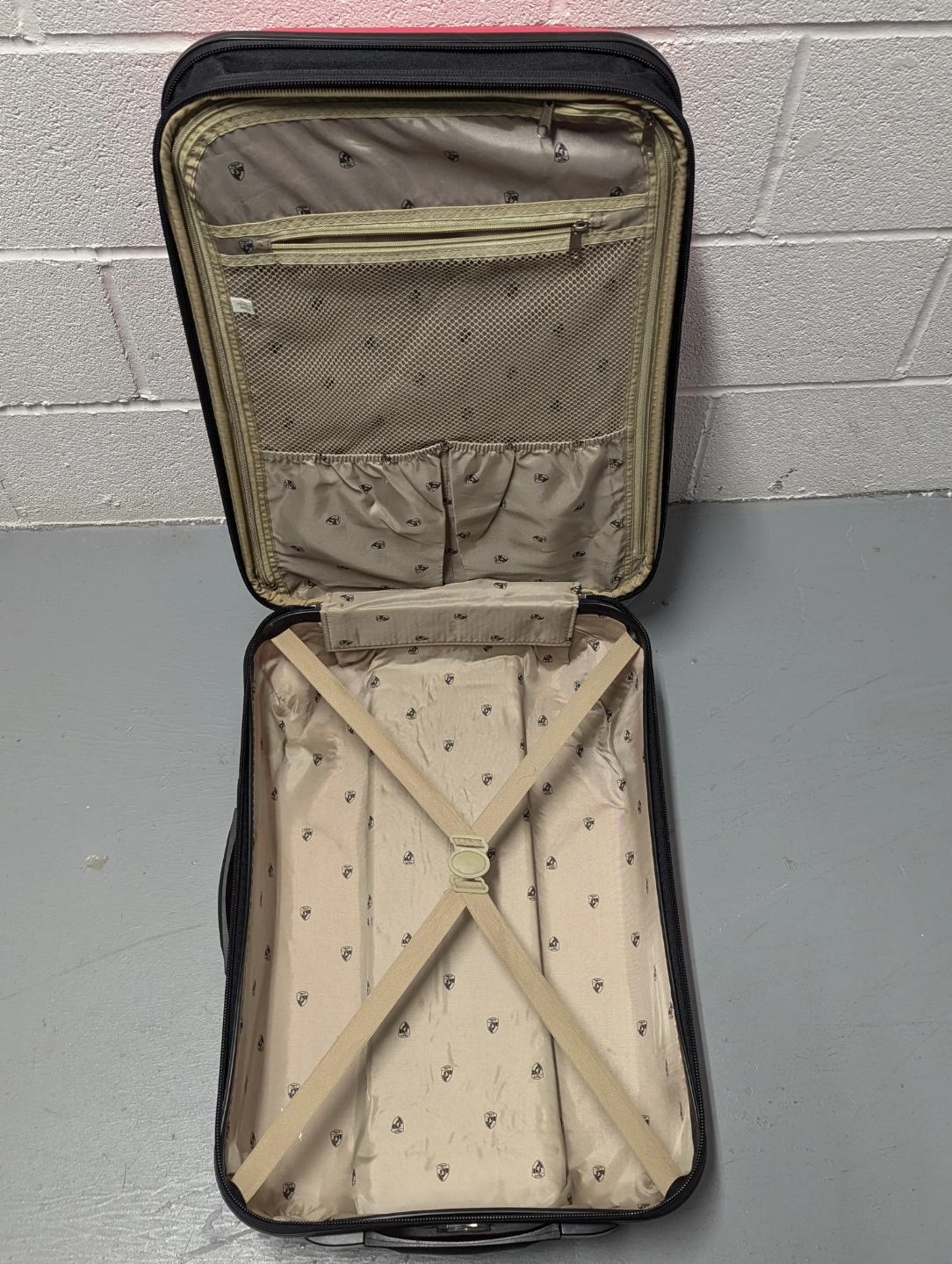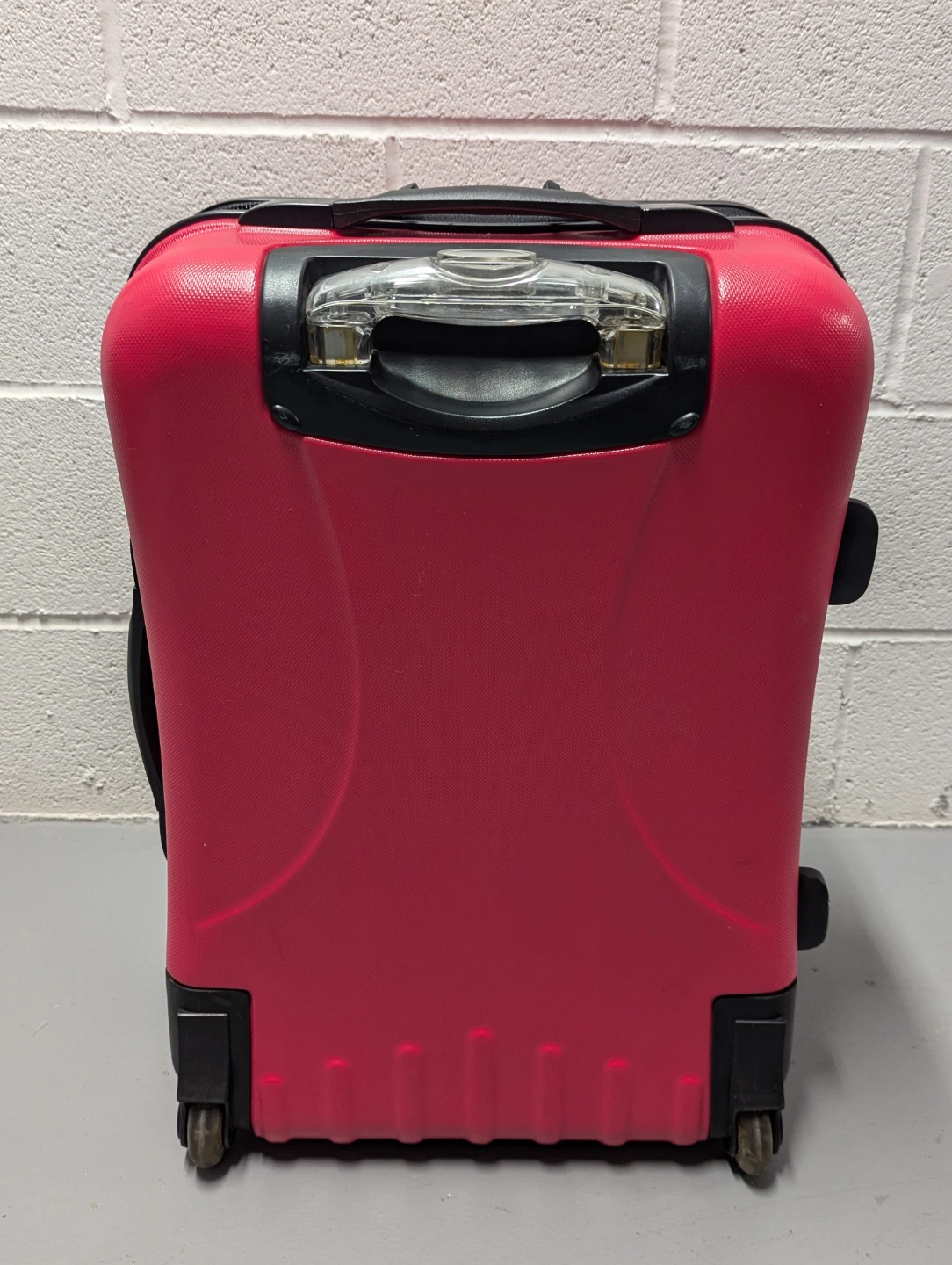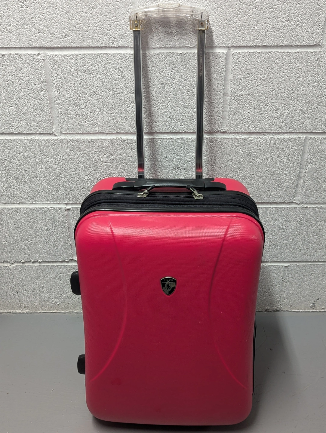Heys pink hard-shell carry-on suitcase. 2 wheels, retractable curved handle, 2" expandable. Pre-owned but almost new condition 9/10. Dimensions: 21 x 15 x 10-12 inches. Opens lengthwise. Zippers and wheels working. Only issue is a stain on the interior lining as shown.