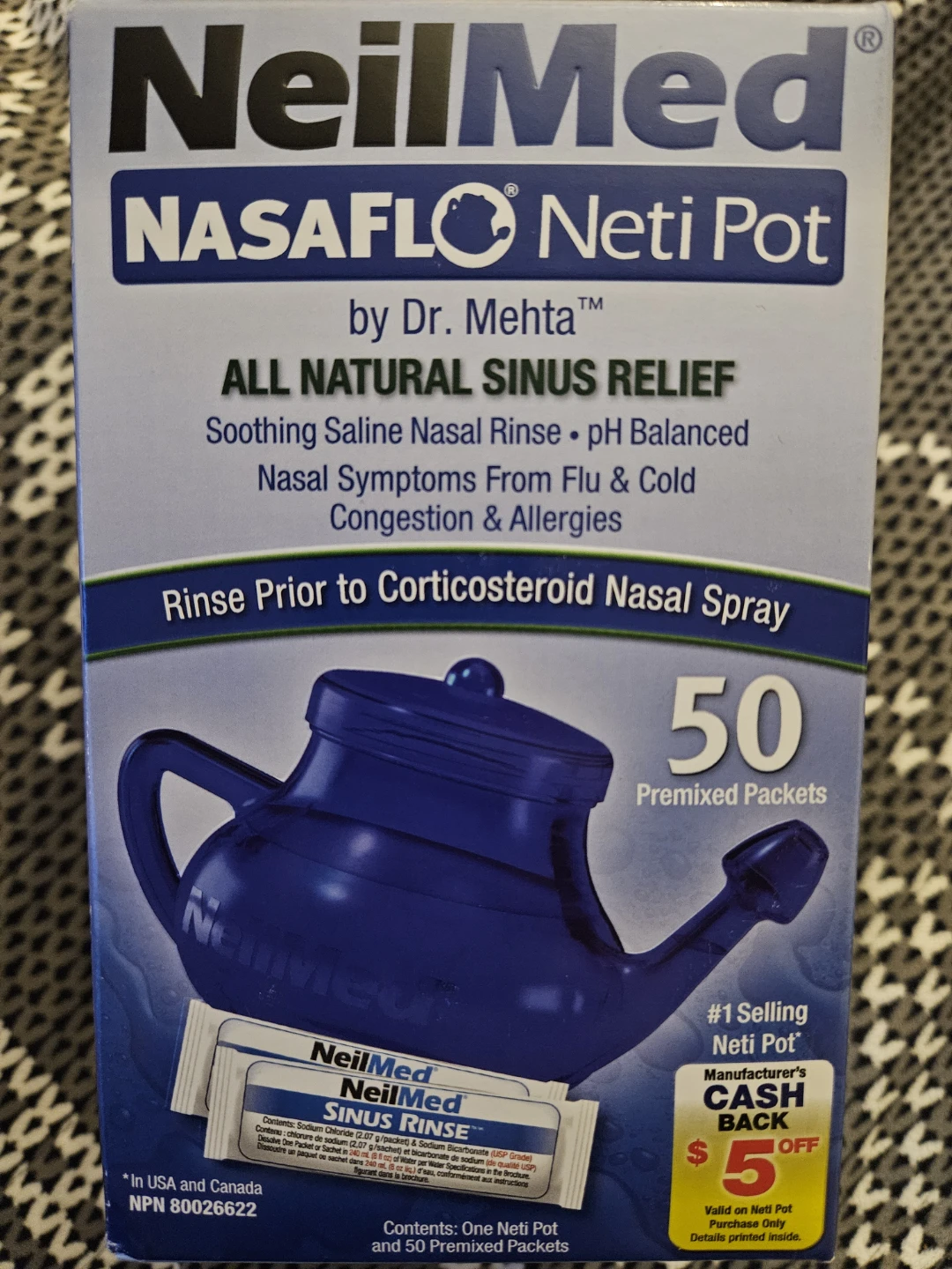 This NeilMed NASAFLO Neti Pot kit comes with one Neti Pot and 50 premixed sinus rinse packets. It's designed for all-natural sinus relief, offering a soothing saline nasal rinse. The kit is suitable for nasal symptoms from flu, colds, congestion, and allergies. Never been open or used