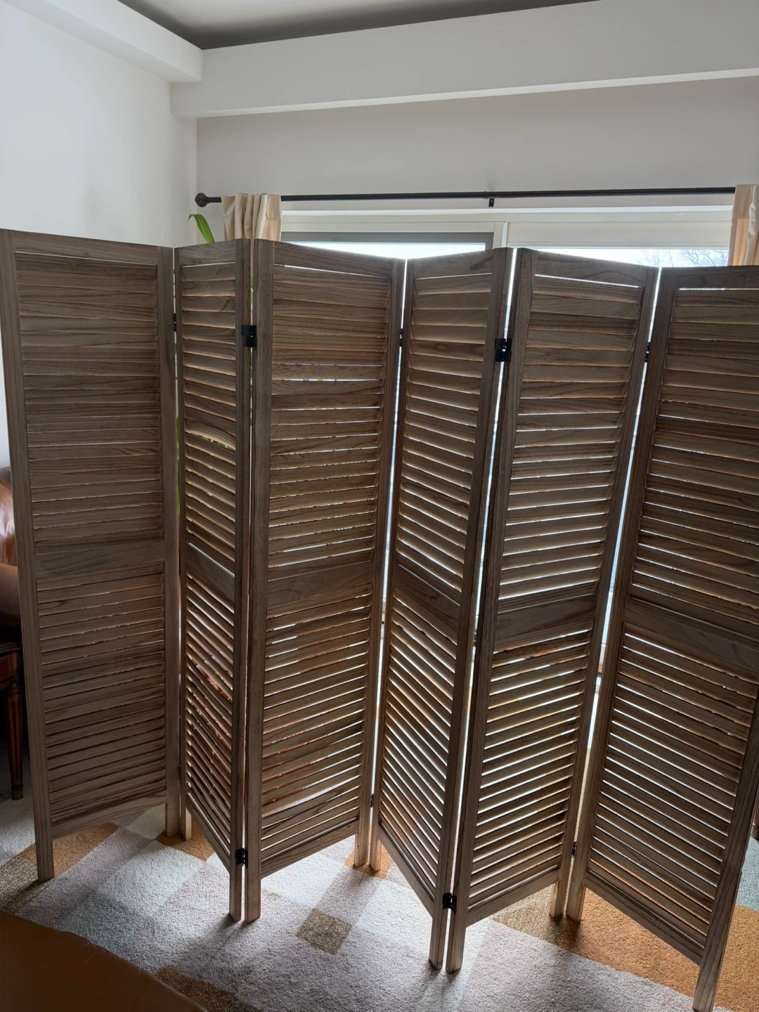 This 6-panel room divider features a slatted wood design. It's perfect for creating privacy or defining spaces in your home. The panels are hinged for easy folding and storage.