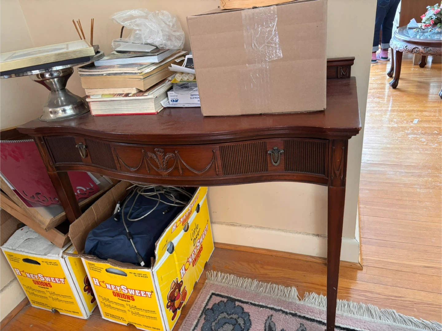 This is a beautiful wooden desk with a single drawer. It has lovely carved details and a curved front. It's a great piece for an entryway or hallway!