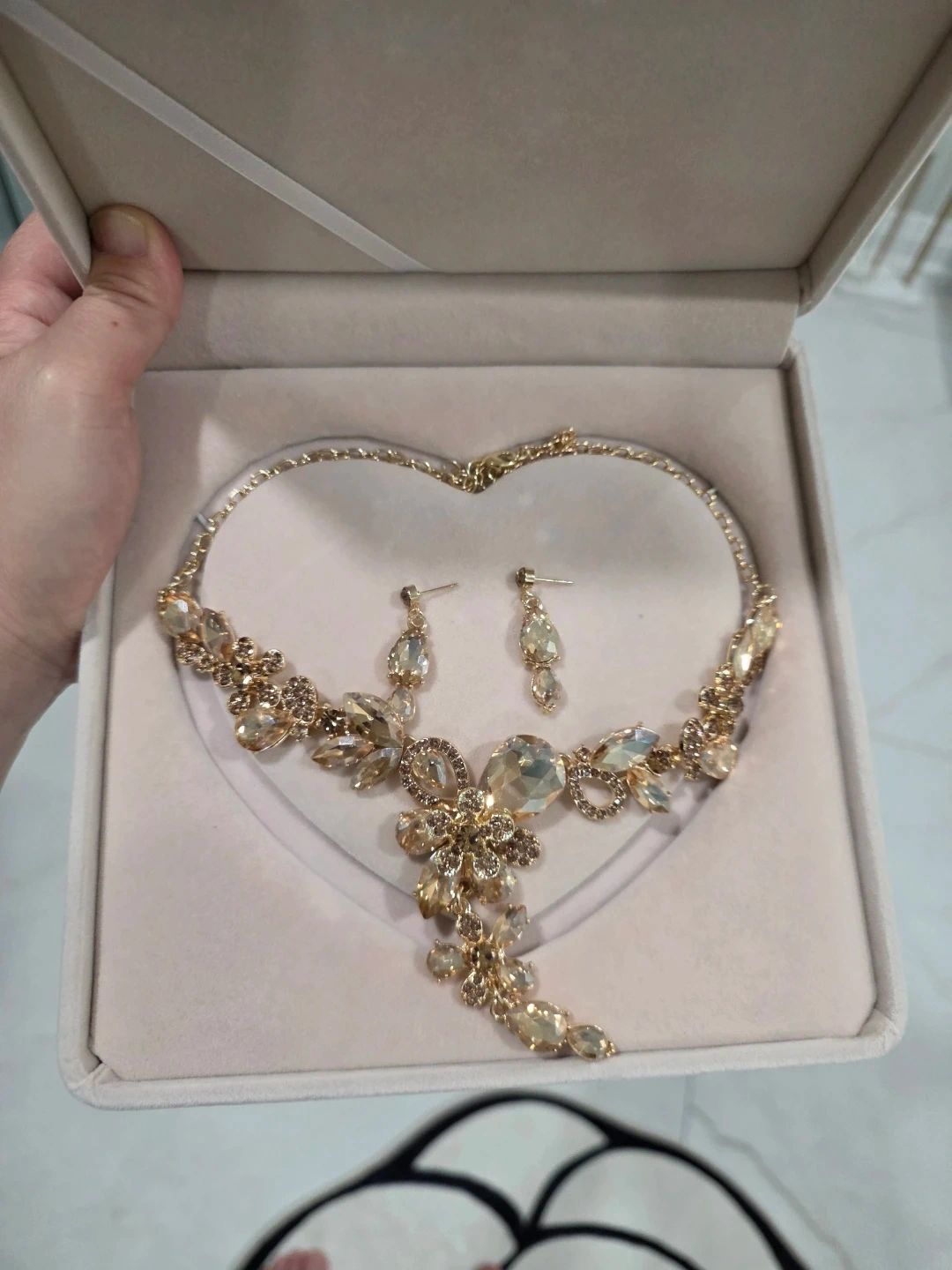 This is a beautiful gold-toned jewellery set. It includes a statement necklace and matching drop earrings. The set is adorned with clear and champagne-coloured crystals. Perfect for special occasions!