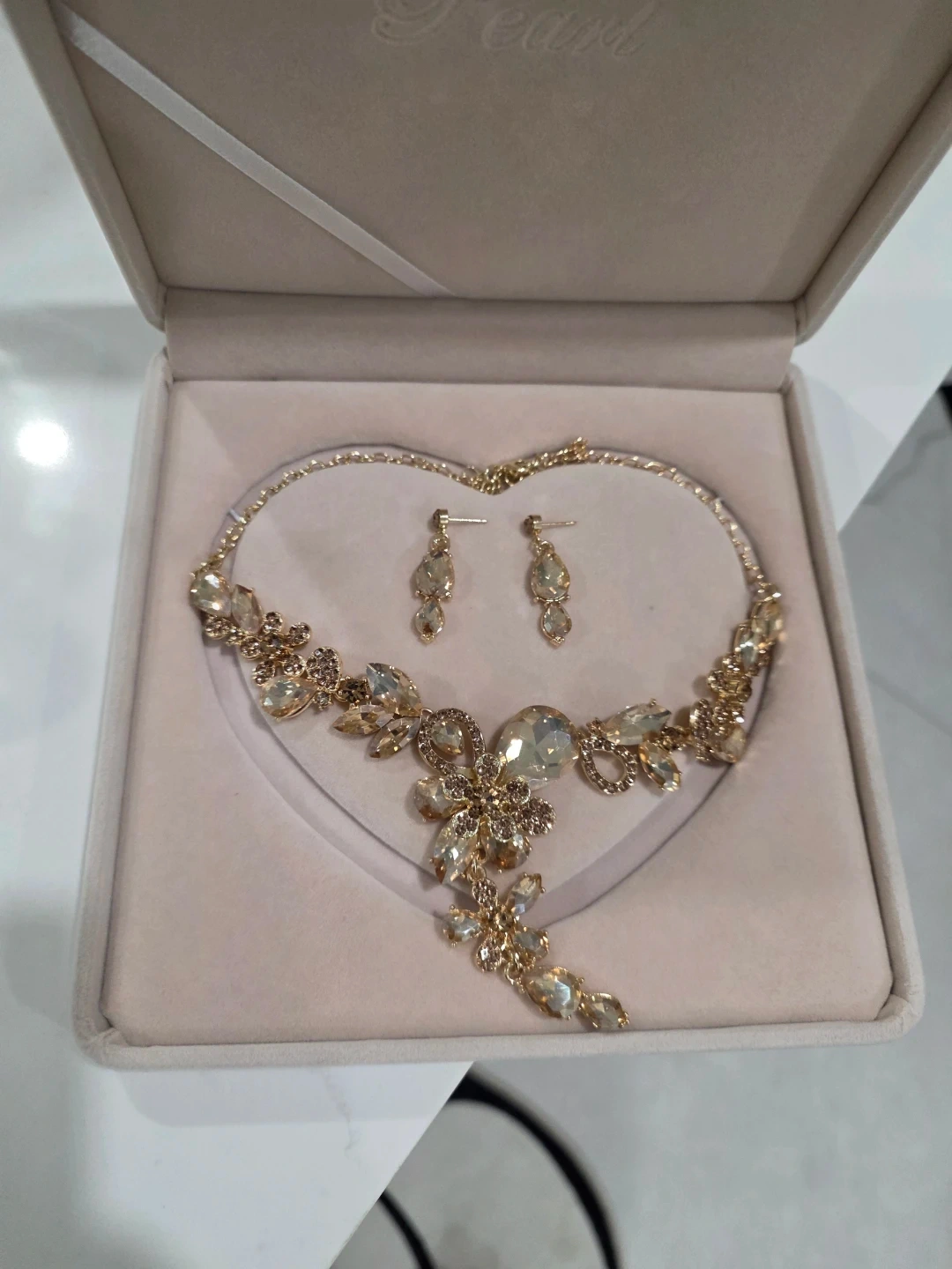 This is a beautiful gold-toned jewellery set. It includes a statement necklace and matching drop earrings. The set is adorned with clear and champagne-coloured crystals. Perfect for special occasions!