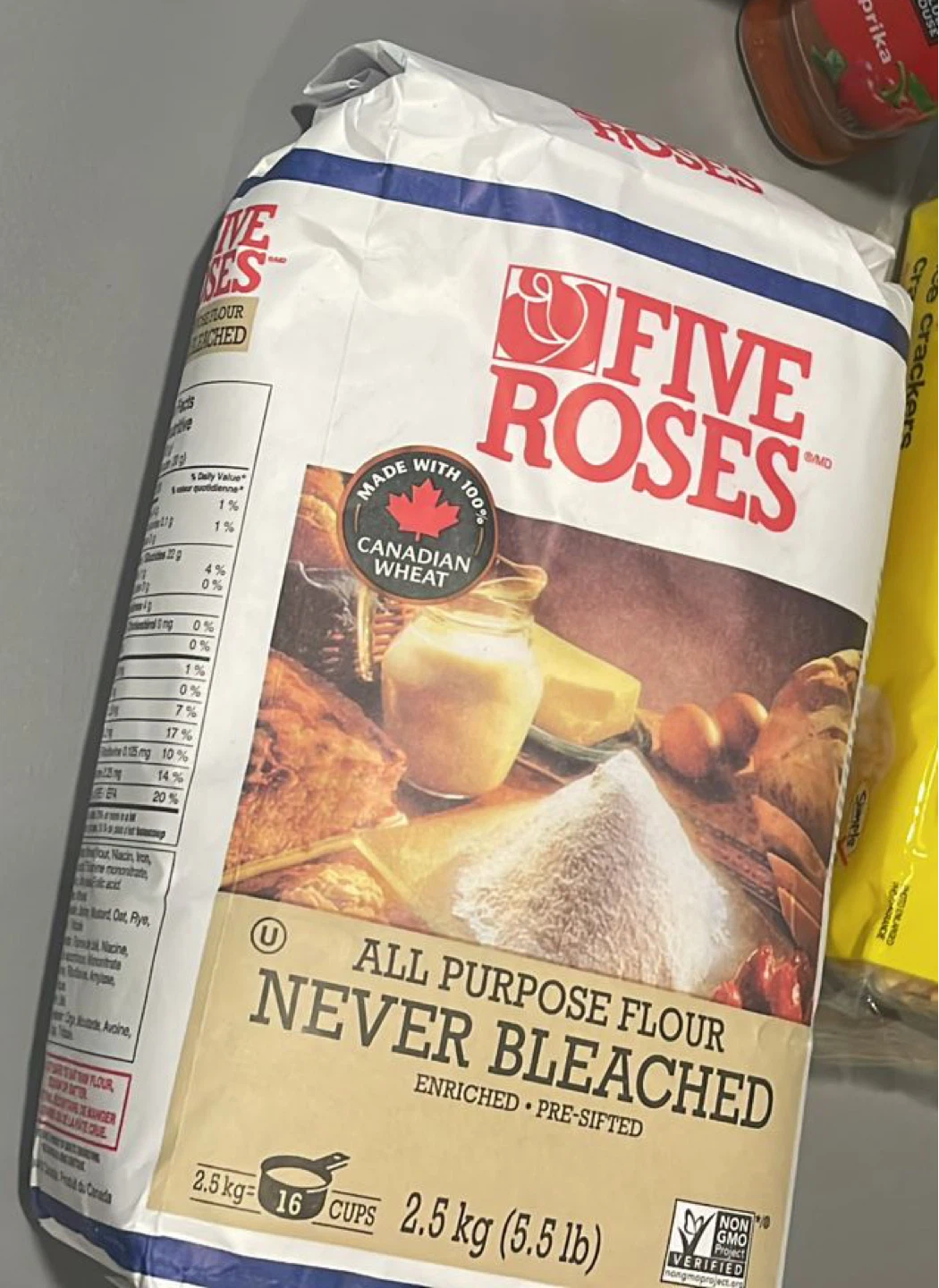 This is a 2.5 kg bag of Five Roses All Purpose Flour. It's never bleached and pre-sifted. Made with 100% Canadian wheat.