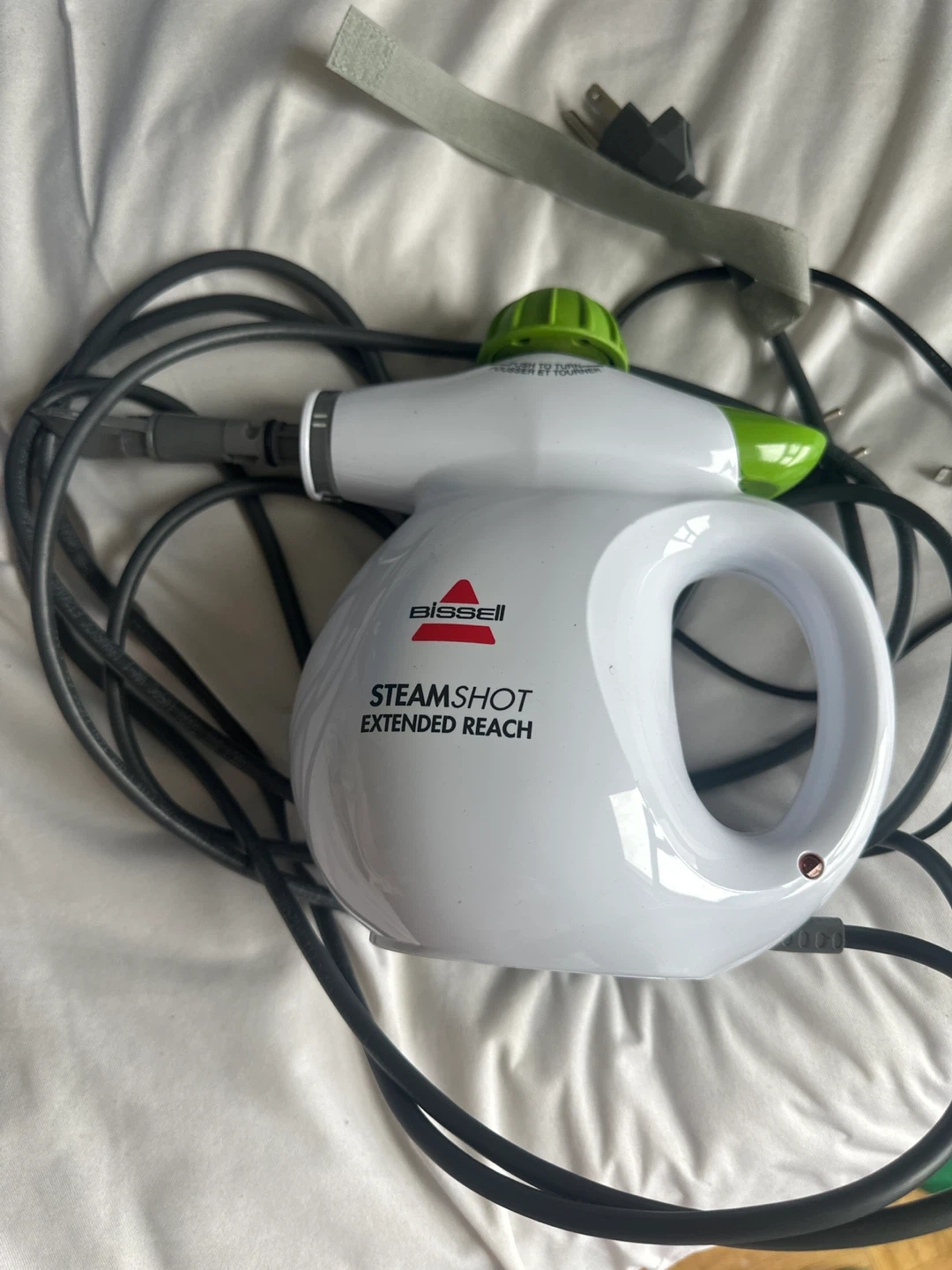 This is a Bissell Steam Shot Extended Reach portable steam cleaner. It's white with green accents and includes a power cord. Steam can be used to clean and sanitize surfaces.