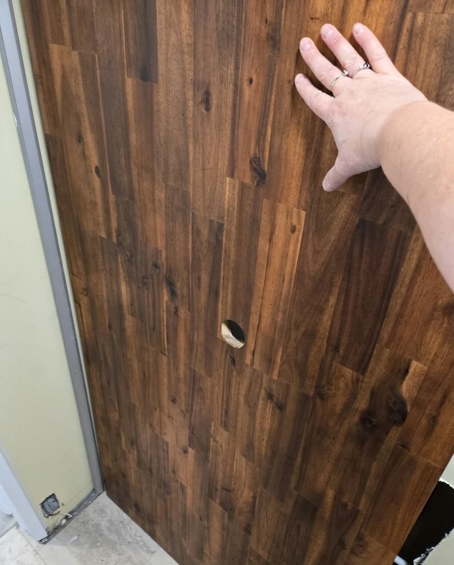 A solid wooden door panel with a rich, dark wood grain finish. It features a pre-drilled hole for hardware. This panel would be great for a DIY project or replacement.