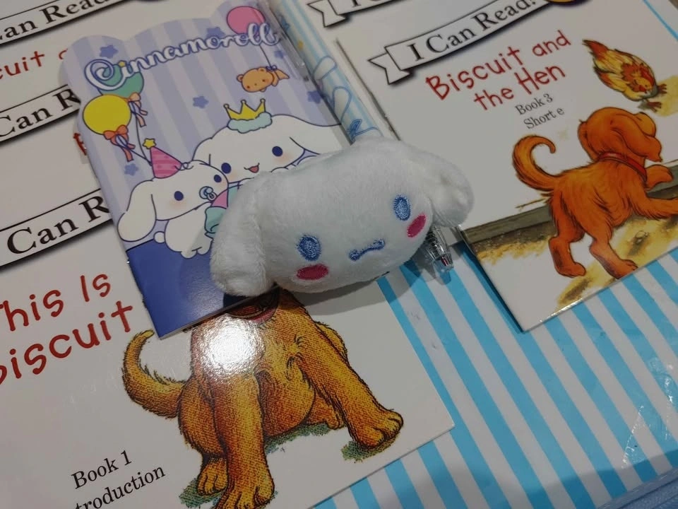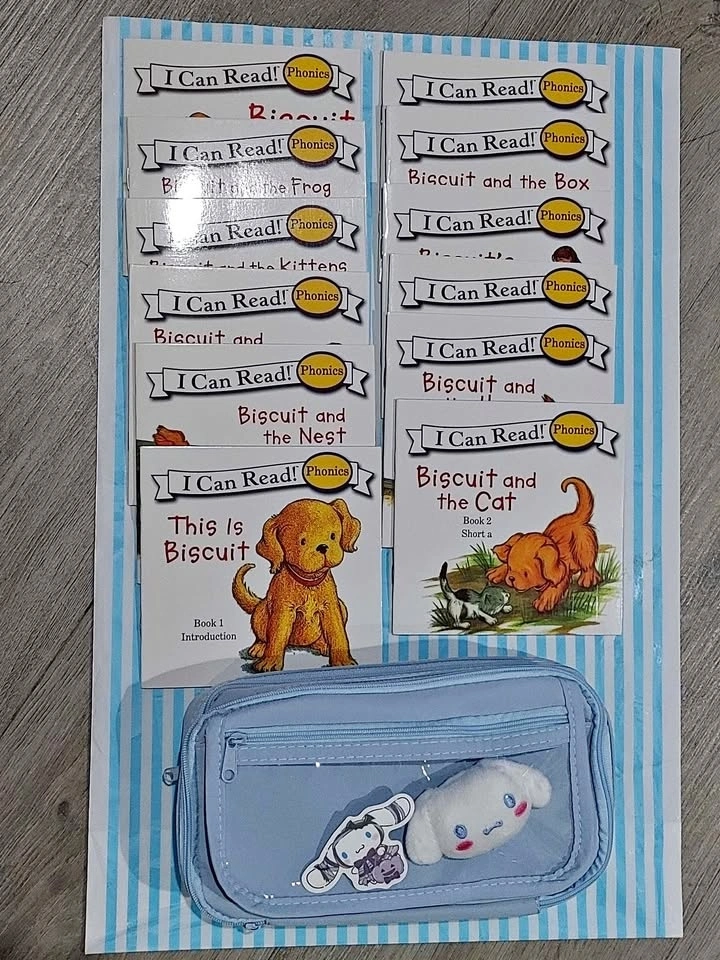 Set includes: "I Can Read! Phonics' books featuring Biscuit the dog. 12 compact books. Mini Cinnamoroll set: pin, small notebook, pen, multi-purpose case with 3 compartments. Pick up at Killarney Community Center at 6260 Killarney St, Vancouver, BC.