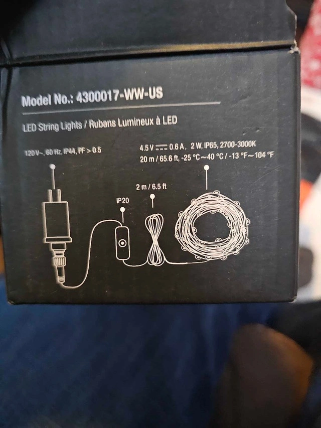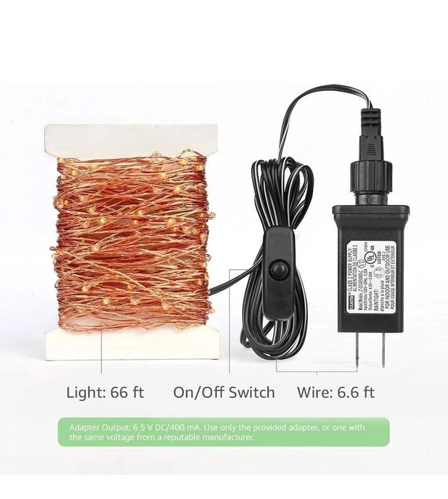 New in box. These 20M (66ft) fairy lights from Lighting EVER feature 200 warm white LEDs (3000K) and are perfect for indoor or outdoor decoration. The copper wire is bendable and flexible, allowing you to create various shapes. They are IP65 waterproof for the string lights and IP44 for the adapter. These lights are plug-and-play and safe for children as they don't overheat. Ideal for holidays, weddings, or simply creating a cozy atmosphere in bedrooms, pergolas, or around railings. For Sale By: Owner.