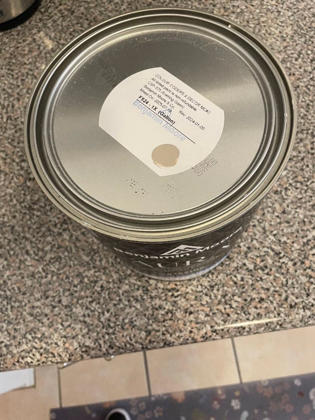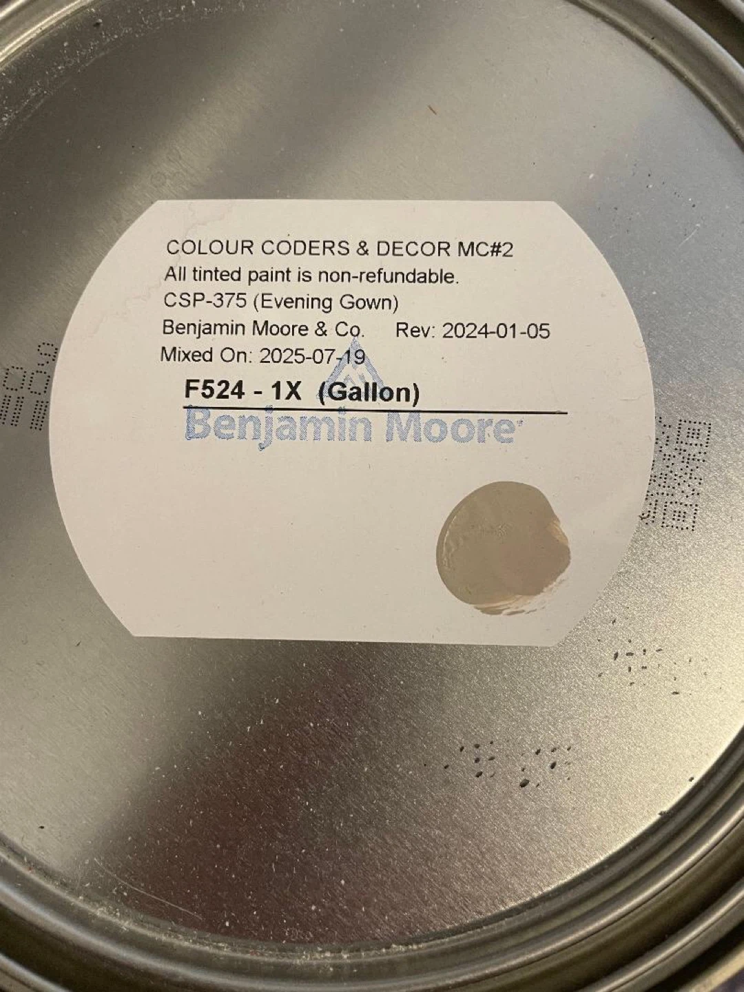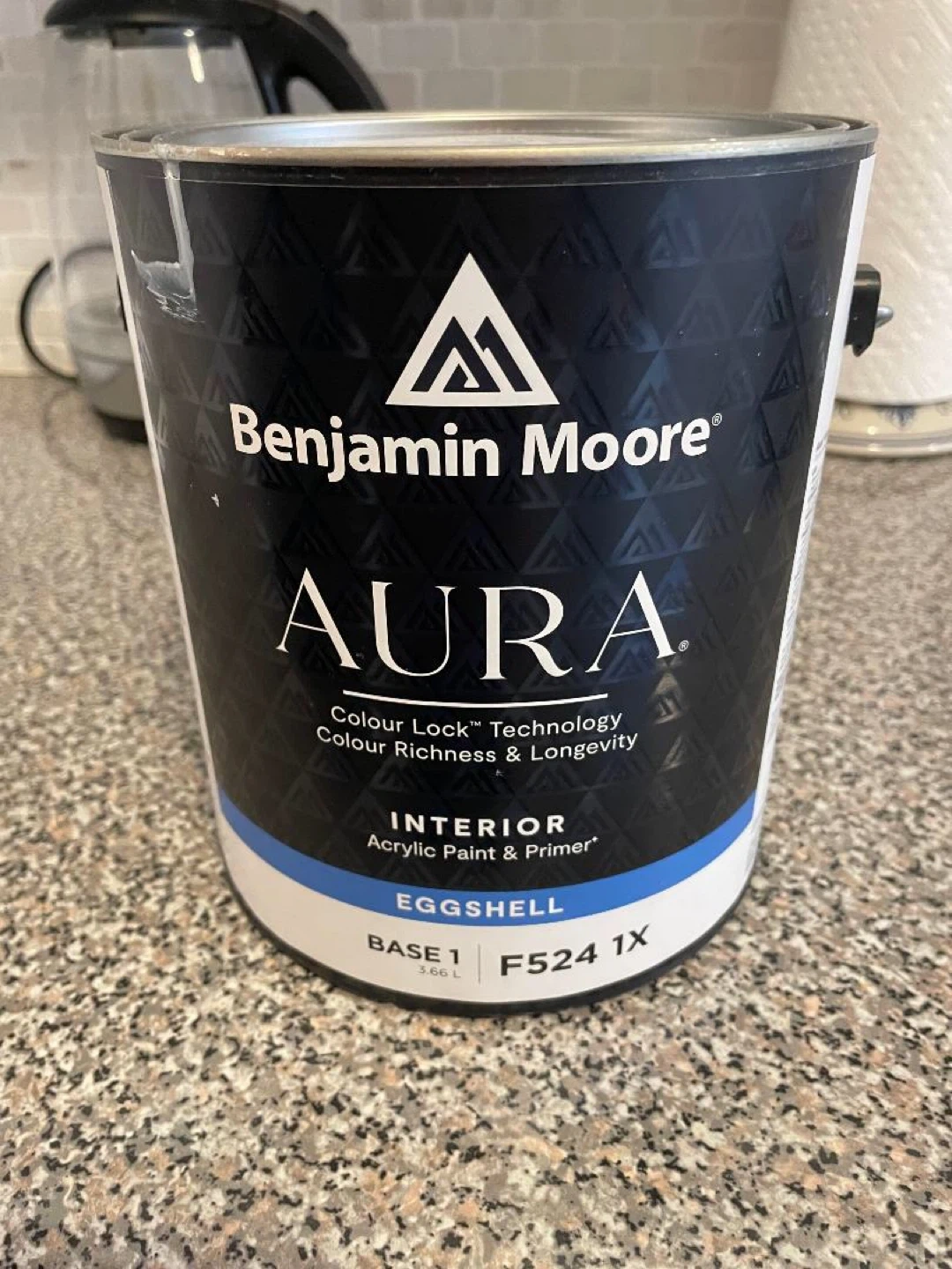 Awesome deal!!! Fresh Benjamin Moore AURA paint. Color is Evening Gown CSP-375, a nice neutral shade. It is interior acrylic paint and primer, eggshell finish. Got a 1 gallon can, Base 1. Enough for a small bedroom/office/den/bathroom. Pick up downtown Oakville.