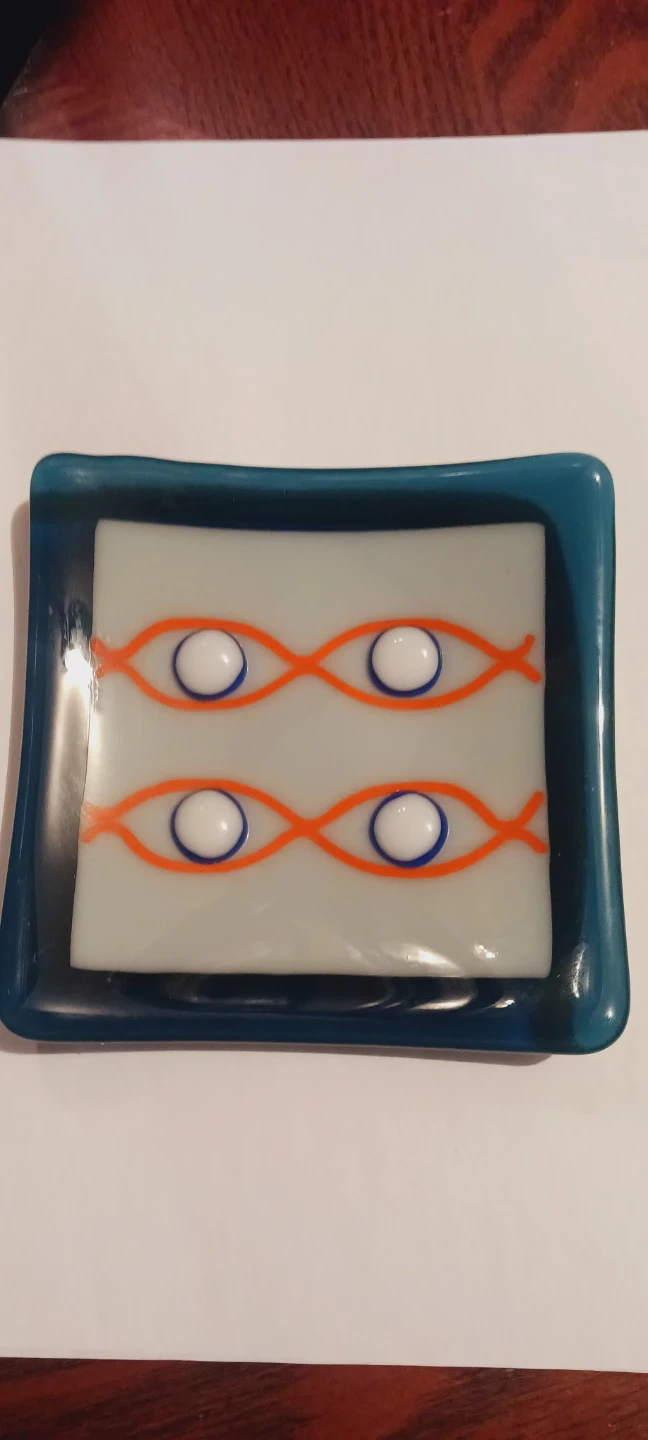 New !! Gorgeous Art Glass Handcrafted Handmade fused glass dish with a decorative orange and blue design. Great for holding small jewelry or change. Glass material. 5"×5". New !! ALL MY PRICES ARE NEGOTIABLE !!