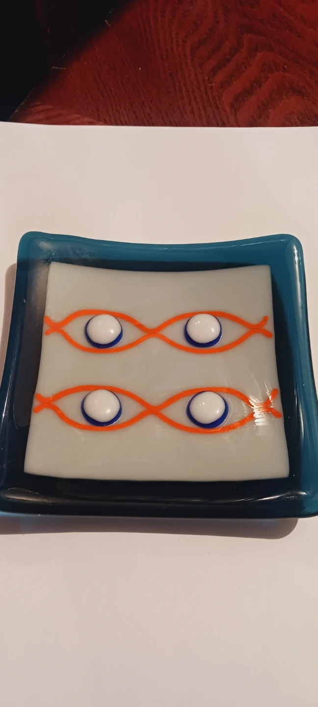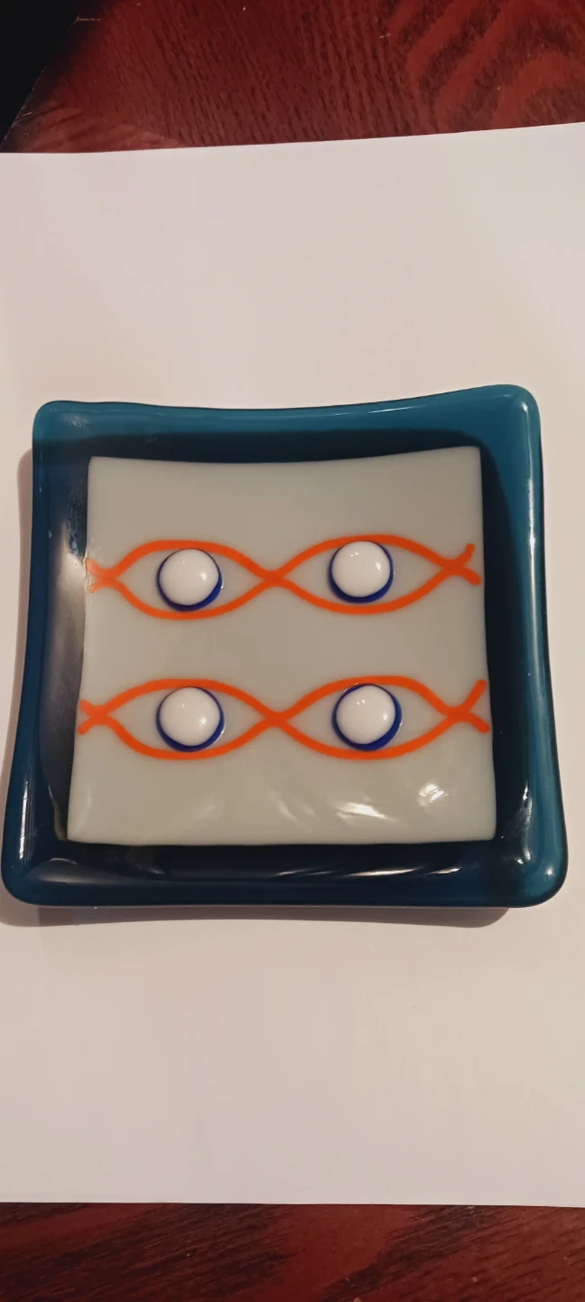 New !! Gorgeous Art Glass Handcrafted Handmade fused glass dish with a decorative orange and blue design. Great for holding small jewelry or change. Glass material. 5"×5". New !! ALL MY PRICES ARE NEGOTIABLE !!