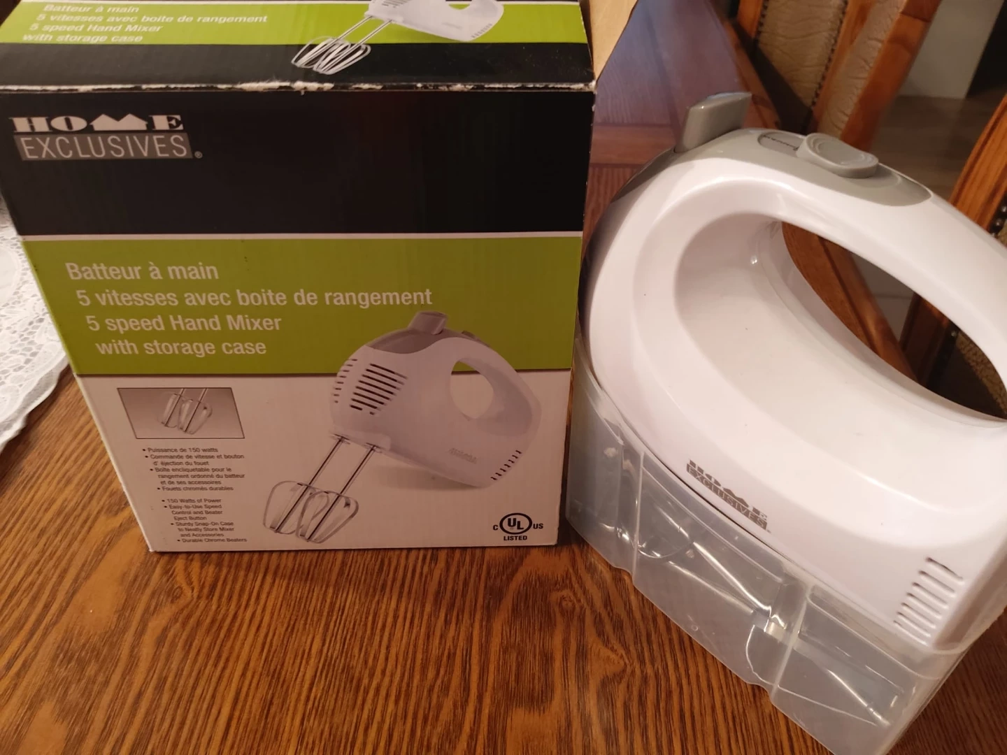 Home Exclusives 5 speed hand mixer. It comes with a storage case for neat storage. Features 150 watts of power and durable chrome beaters.