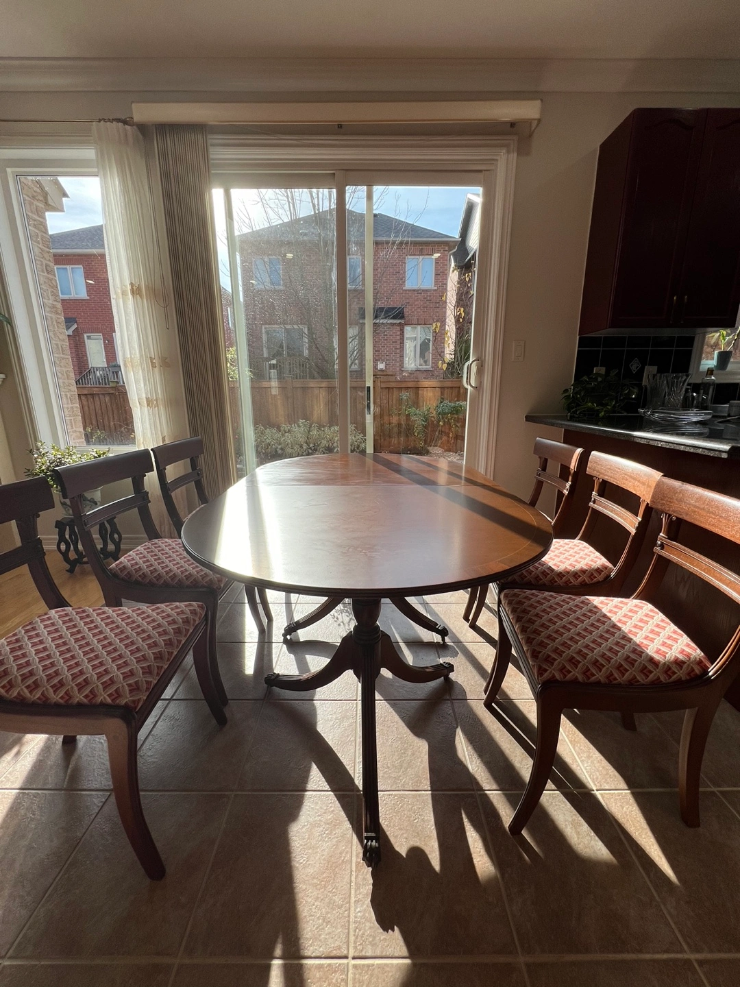 Oval dining table with 6 chairs. Table has a beautiful wood finish. Everything in new condition. Moving sale, bought for staging.