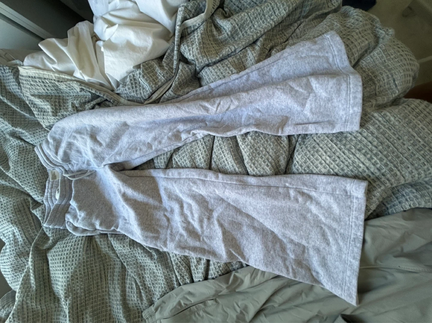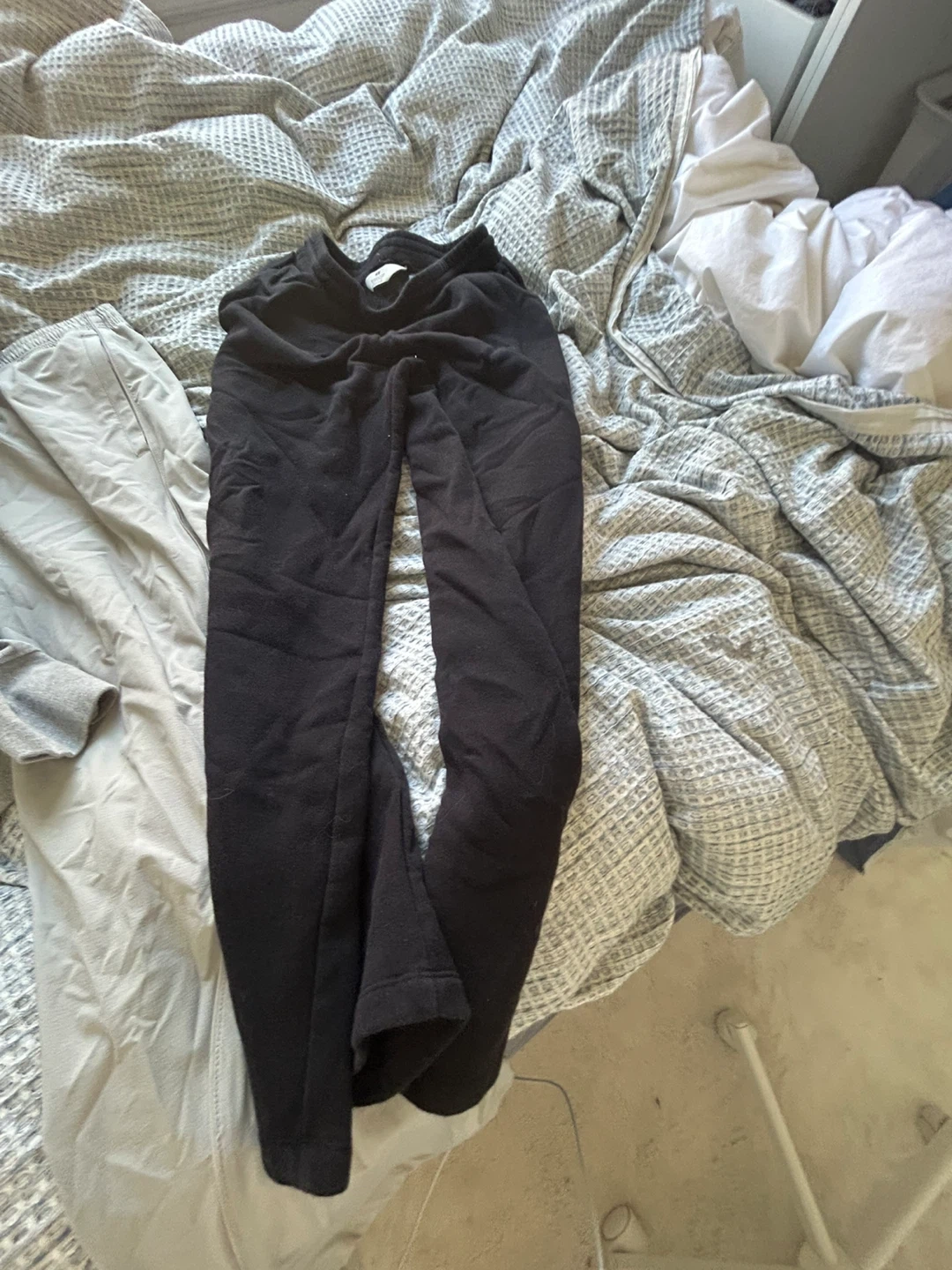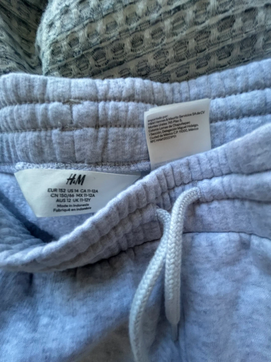 Two pairs of H&M kids sweatpants. Grey pair is size 12-14Y, black pair is size 11-12Y. Both are made from a cotton-polyester blend.
