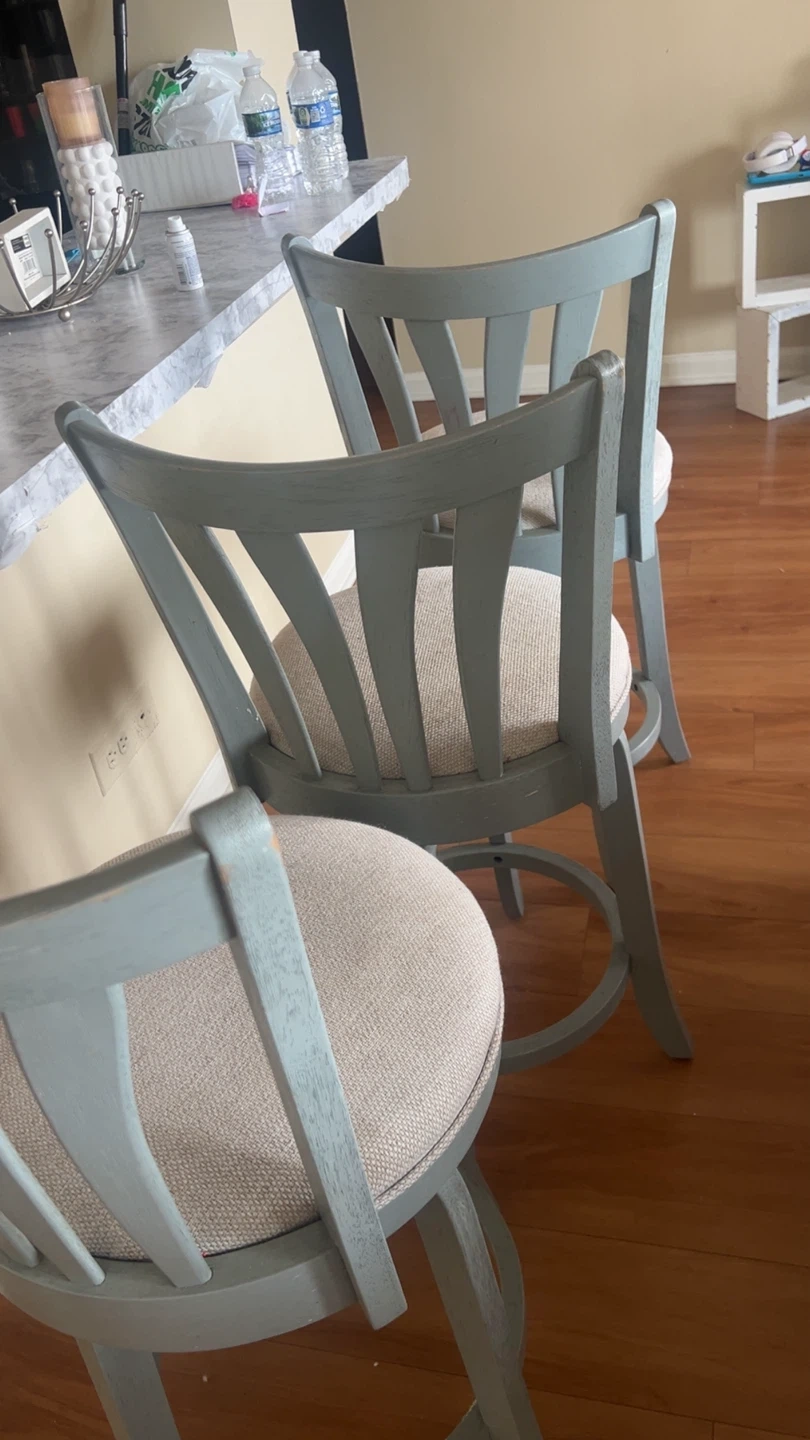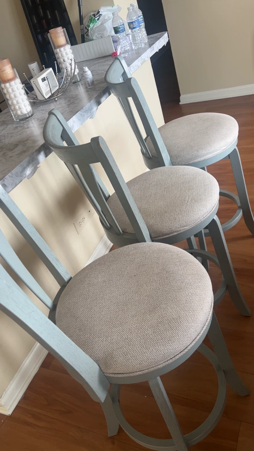Three grey bar stools with upholstered light beige seats. They feature a swivel function and a sturdy footrest. These stools are perfect for a kitchen island or bar area! The distressed grey finish adds a charming touch. Clean and sturdy has some paint imperfections but with a little touch up can be renewed. Cash only pick up