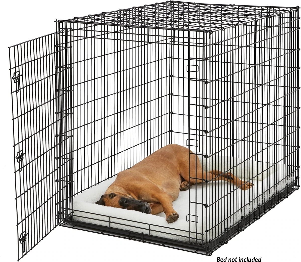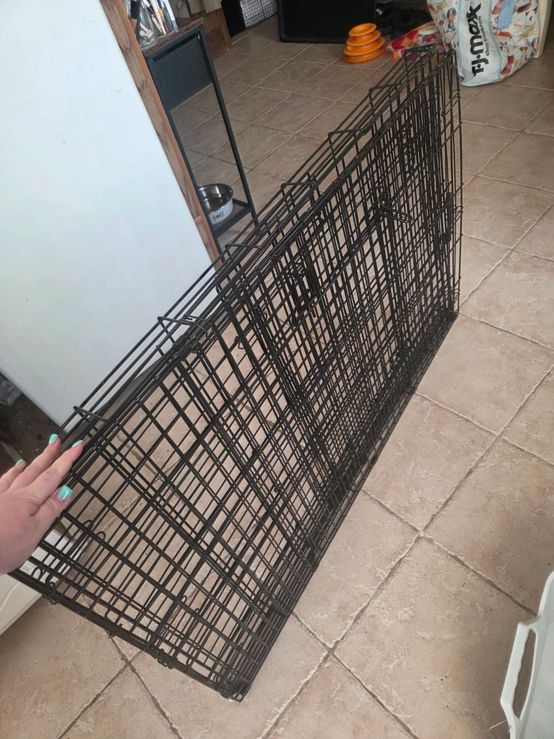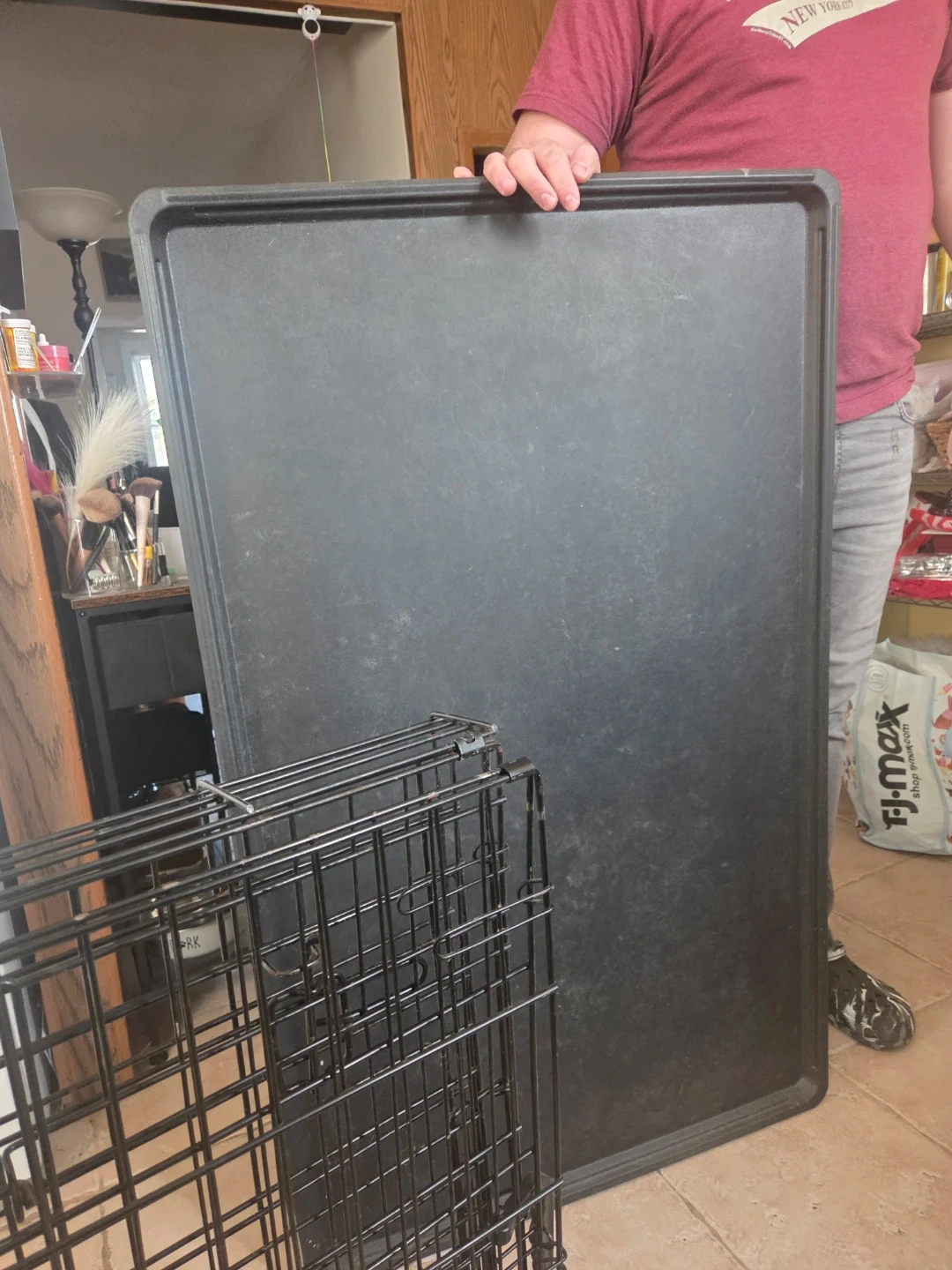 Wire pet crate and a large black plastic tray. The crate folds flat for storage. Tray is sturdy and can be used as a liner or base for the crate.