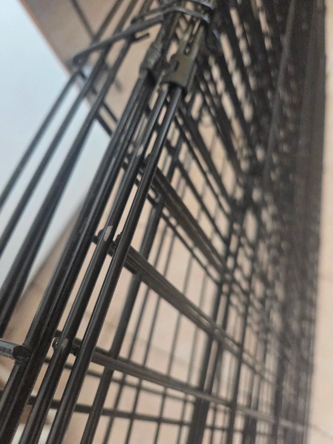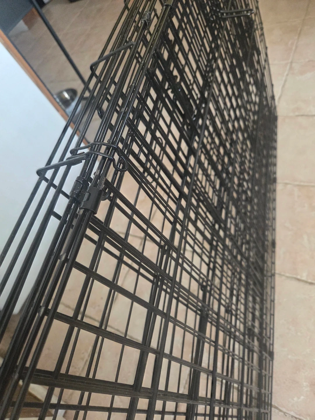 Wire pet crate and a large black plastic tray. The crate folds flat for storage. Tray is sturdy and can be used as a liner or base for the crate.