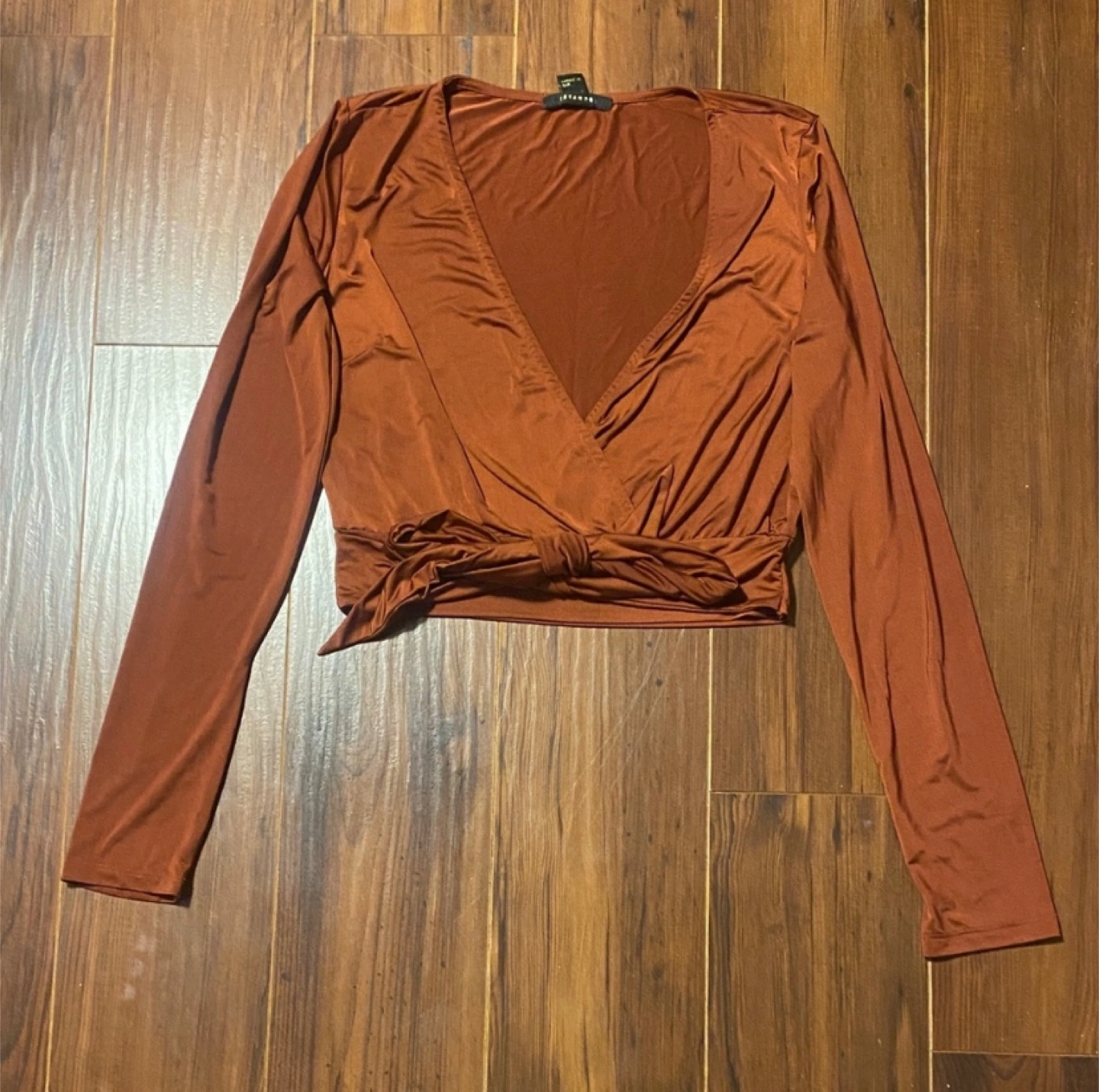 Selling a Revamped long sleeve top in a lovely brown colour. It's a size L and features a stylish tie at the waist. Perfect for adding a touch of elegance to your wardrobe!