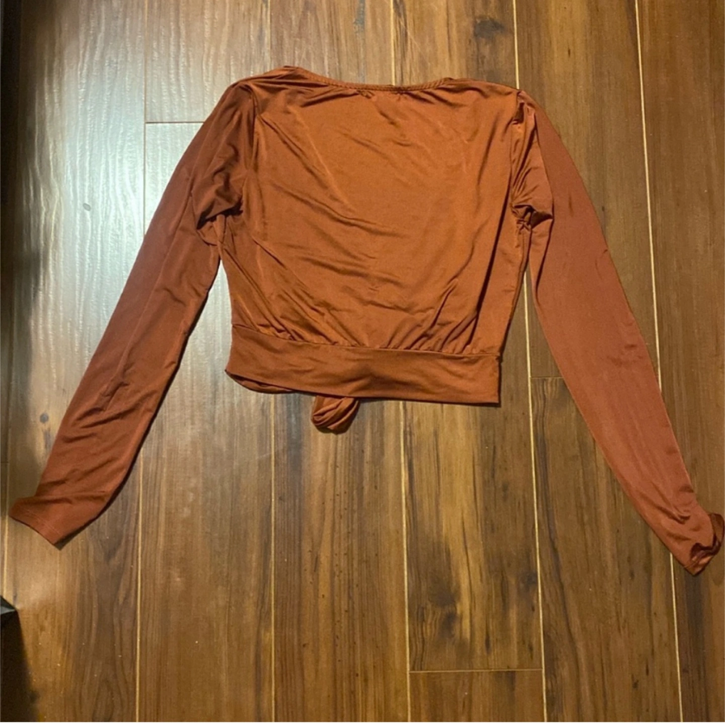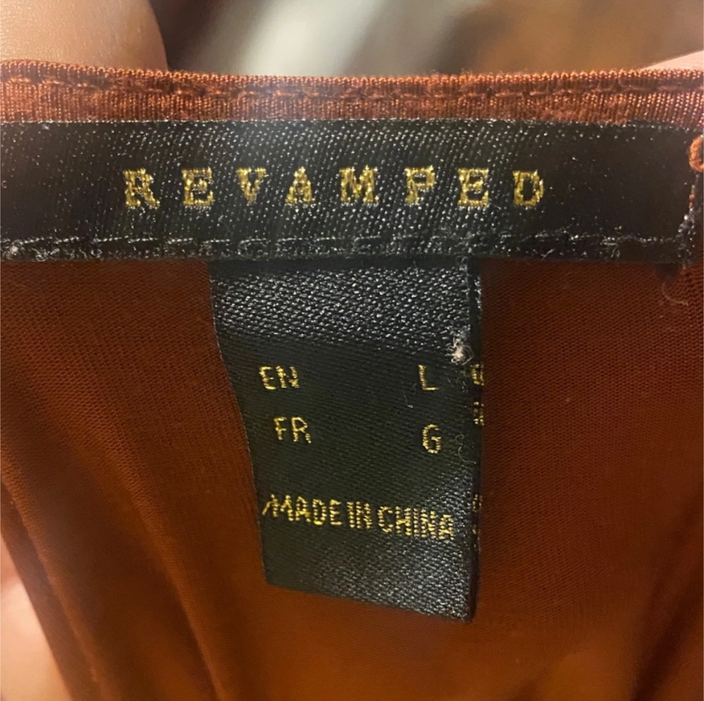 Selling a Revamped long sleeve top in a lovely brown colour. It's a size L and features a stylish tie at the waist. Perfect for adding a touch of elegance to your wardrobe!
