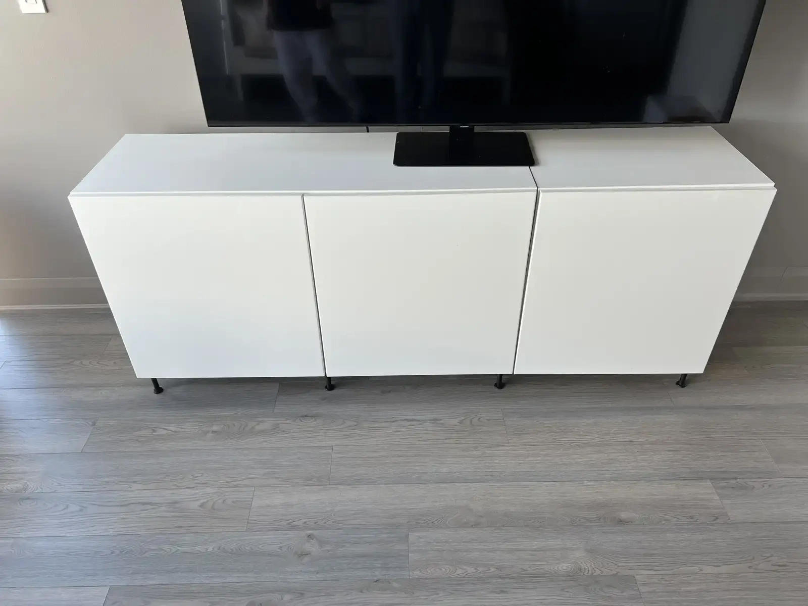 This unit features a clean, modern design with spring push-open doors (no handles), making it perfect for a minimalist or Scandinavian-style space. The stand is sturdy, clean, and well cared for, with no damage, scuffs, or visible wear.