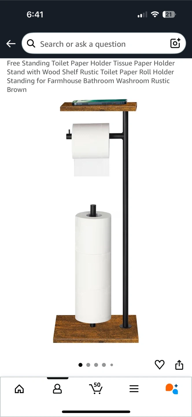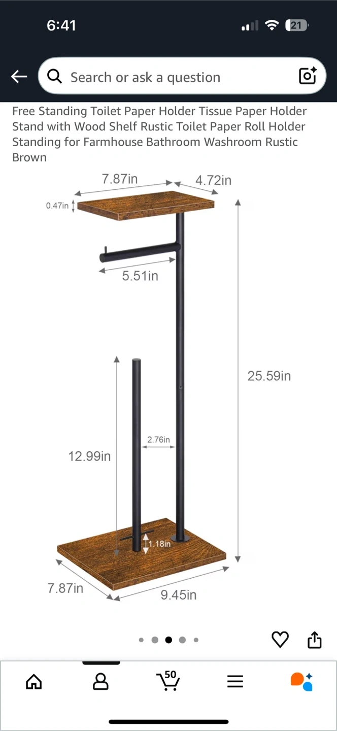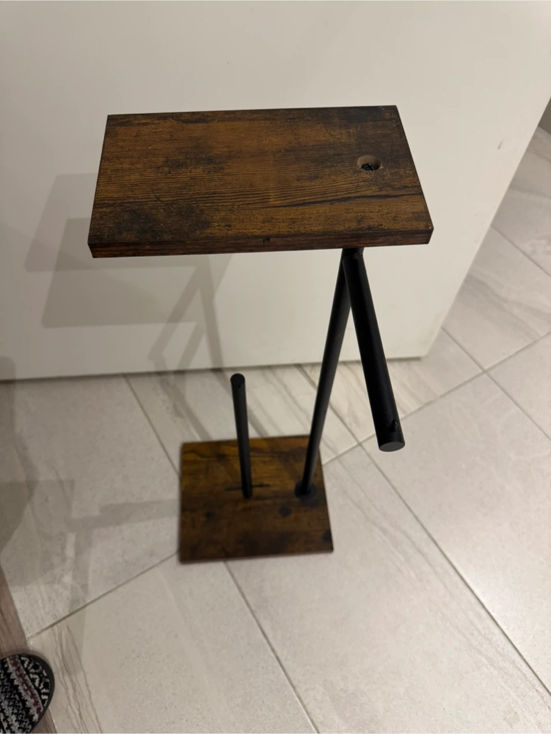 Free standing toilet paper holder with a rustic brown wood shelf. It has a non-slip pad and a heavy duty base to stand firmly on the floor without scratching it. The dimensions are approximately 7.87" x 9.45" at the base and 25.59" tall. There is a wooden shelf on top for phone or wipes. The top can be positioned a few different ways based on preference. Originally bought for $23.99. Selling this item as I’m moving and it’s no longer needed. Less than 2 months old and is in new condition.