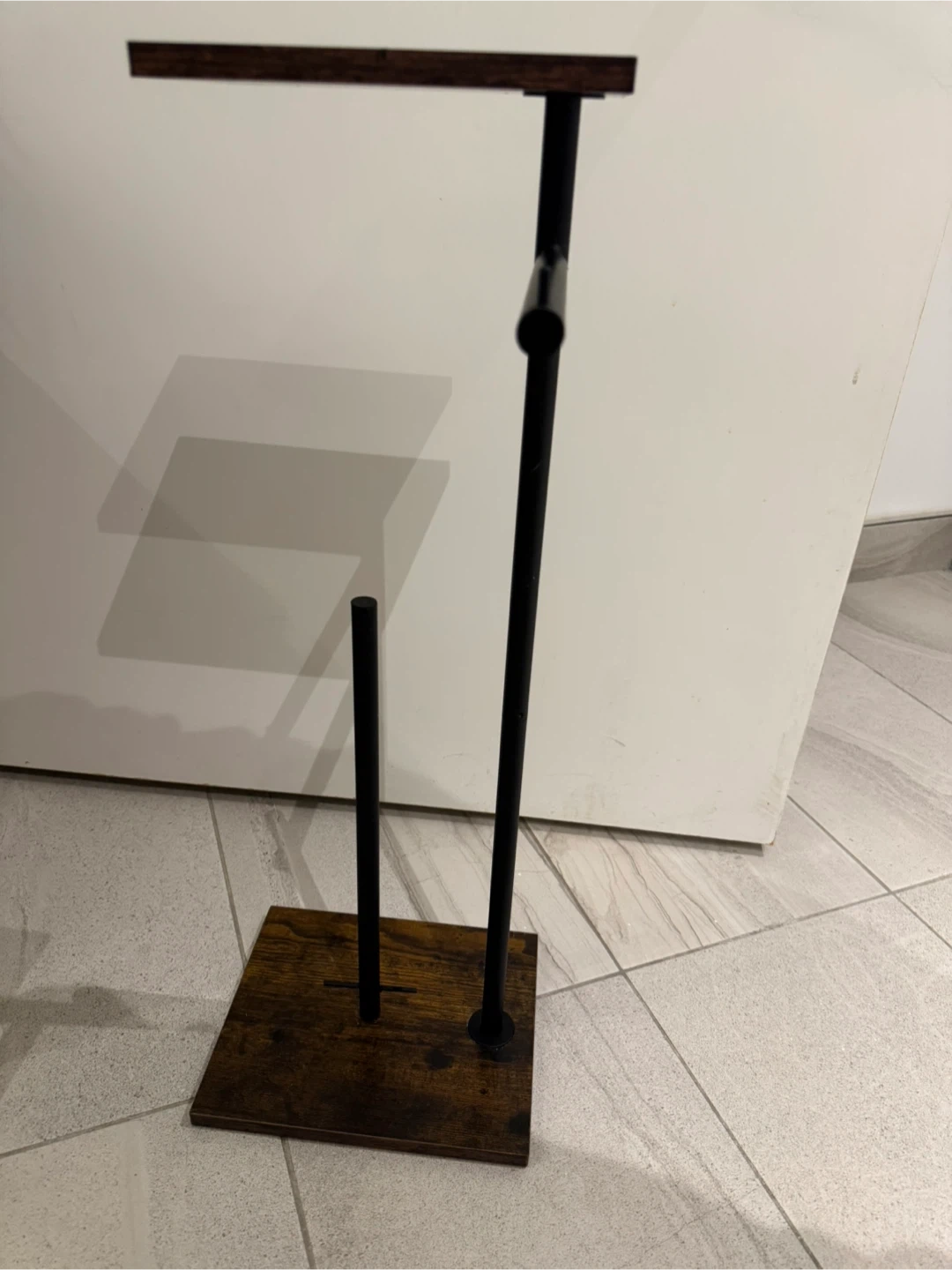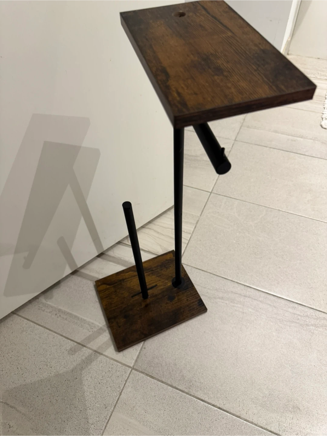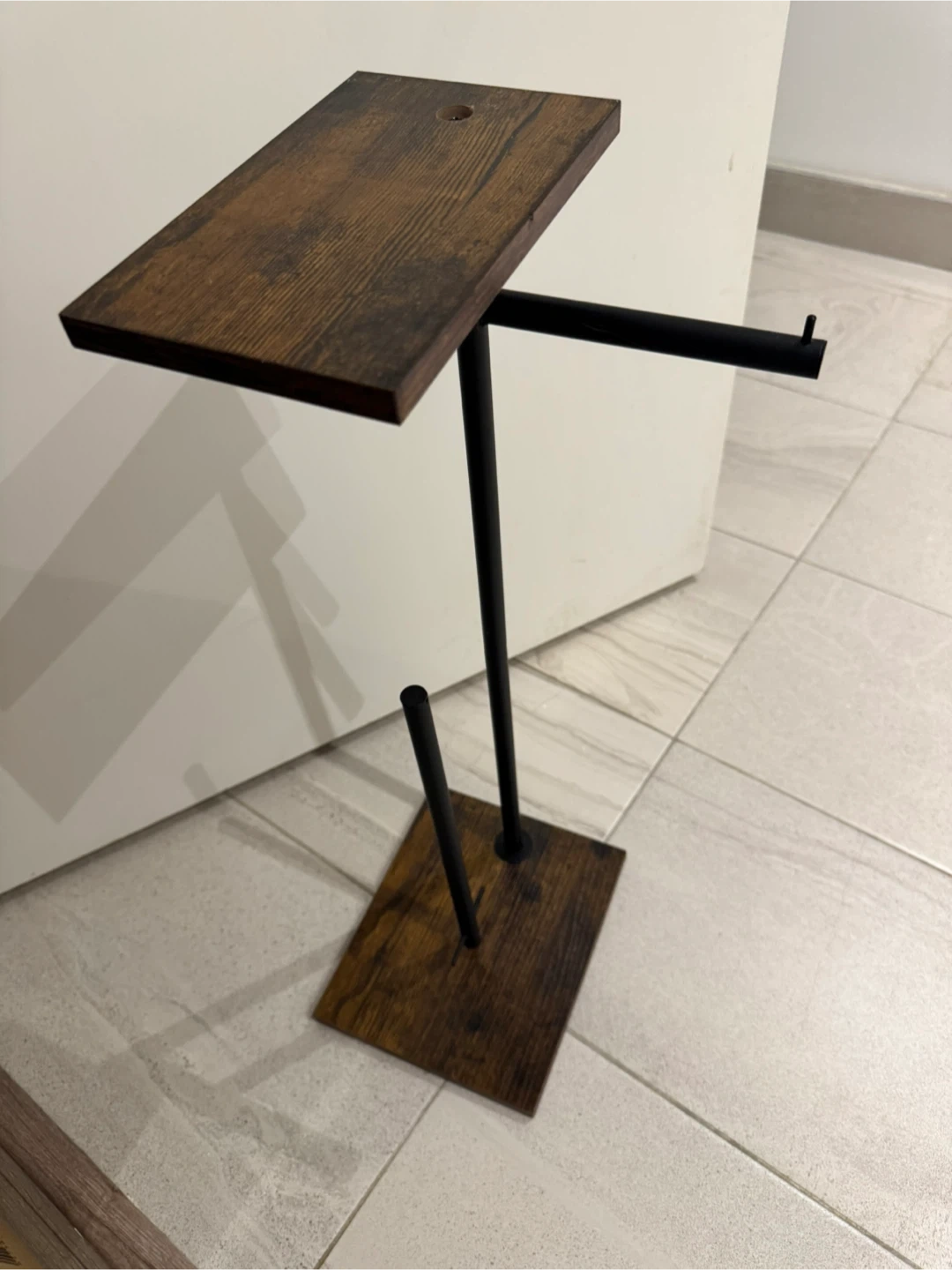 Free standing toilet paper holder with a rustic brown wood shelf. It has a non-slip pad and a heavy duty base to stand firmly on the floor without scratching it. The dimensions are approximately 7.87" x 9.45" at the base and 25.59" tall. There is a wooden shelf on top for phone or wipes. The top can be positioned a few different ways based on preference. Originally bought for $23.99. Selling this item as I’m moving and it’s no longer needed. Less than 2 months old and is in new condition.