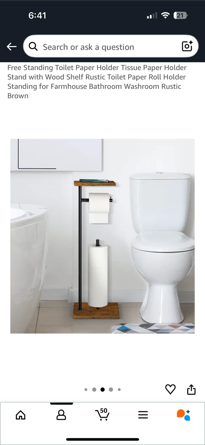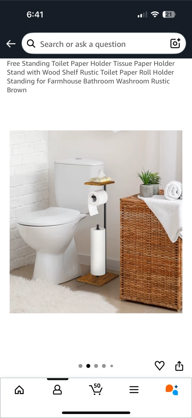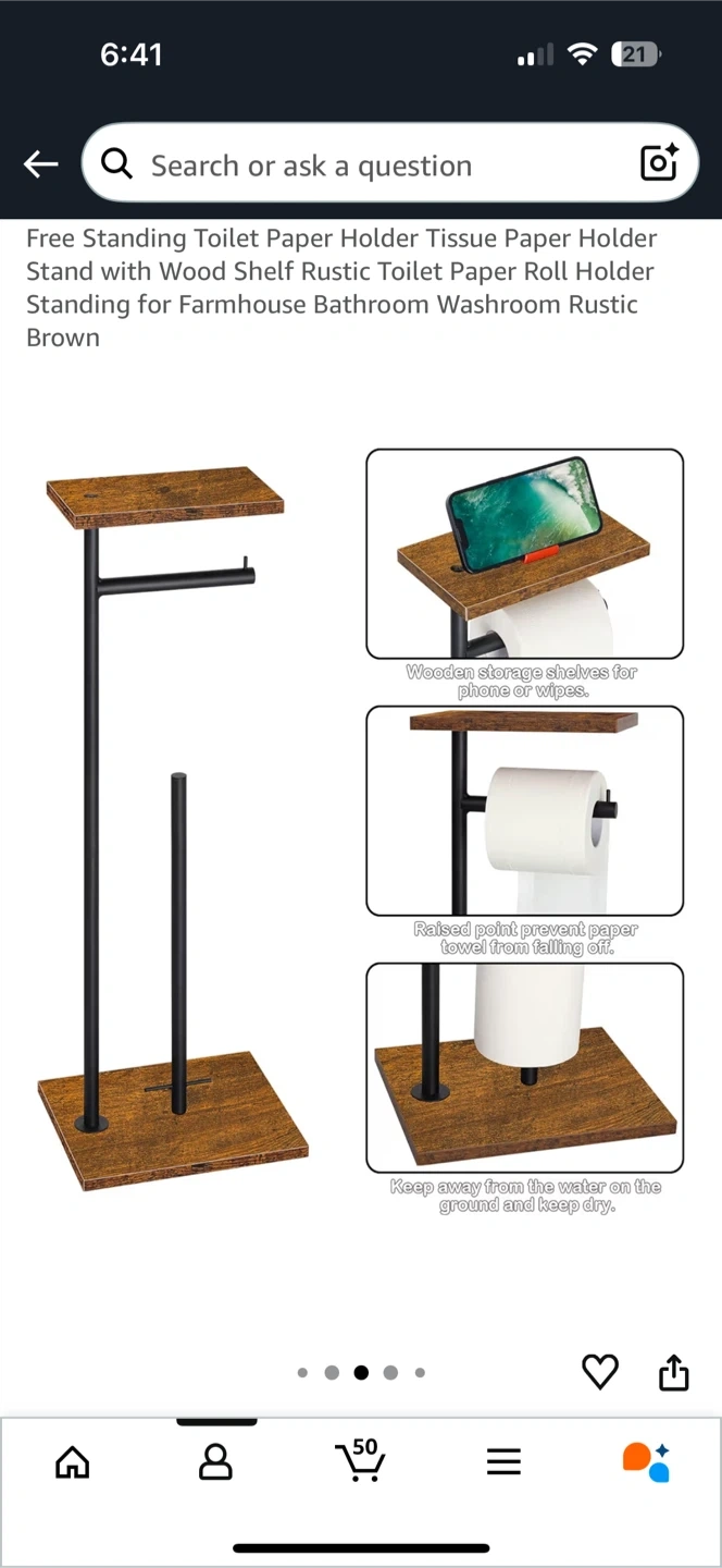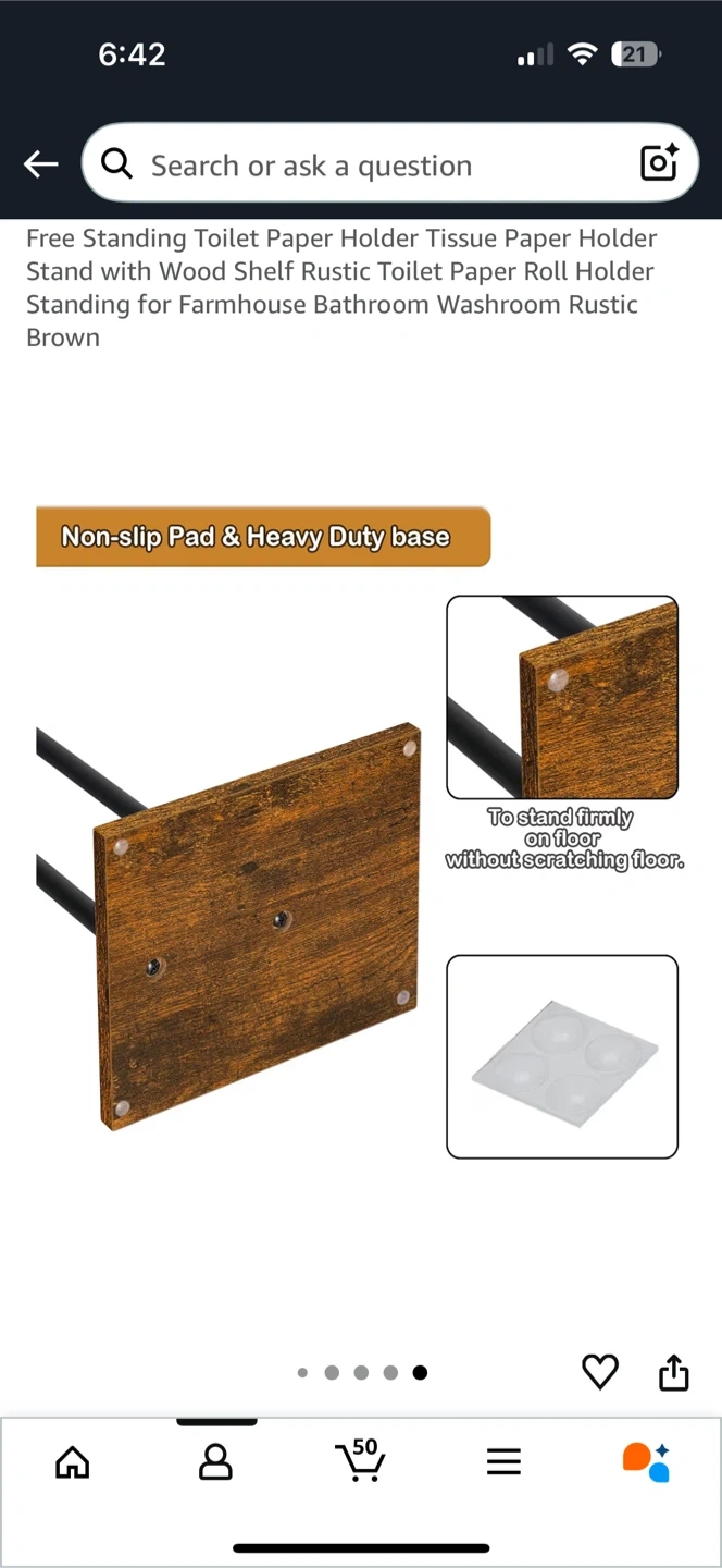 Free standing toilet paper holder with a rustic brown wood shelf. It has a non-slip pad and a heavy duty base to stand firmly on the floor without scratching it. The dimensions are approximately 7.87" x 9.45" at the base and 25.59" tall. There is a wooden shelf on top for phone or wipes. The top can be positioned a few different ways based on preference. Originally bought for $23.99. Selling this item as I’m moving and it’s no longer needed. Less than 2 months old and is in new condition.