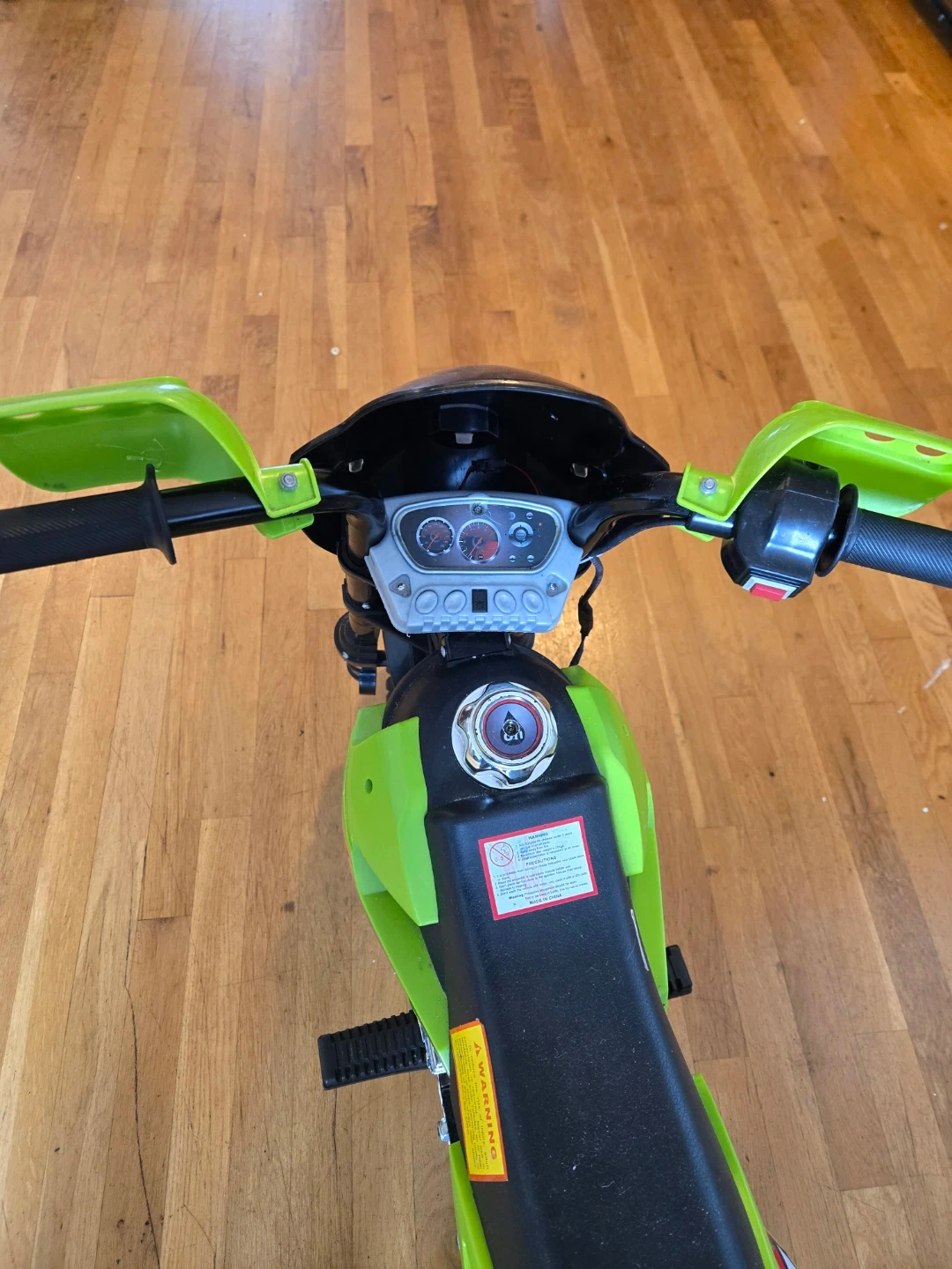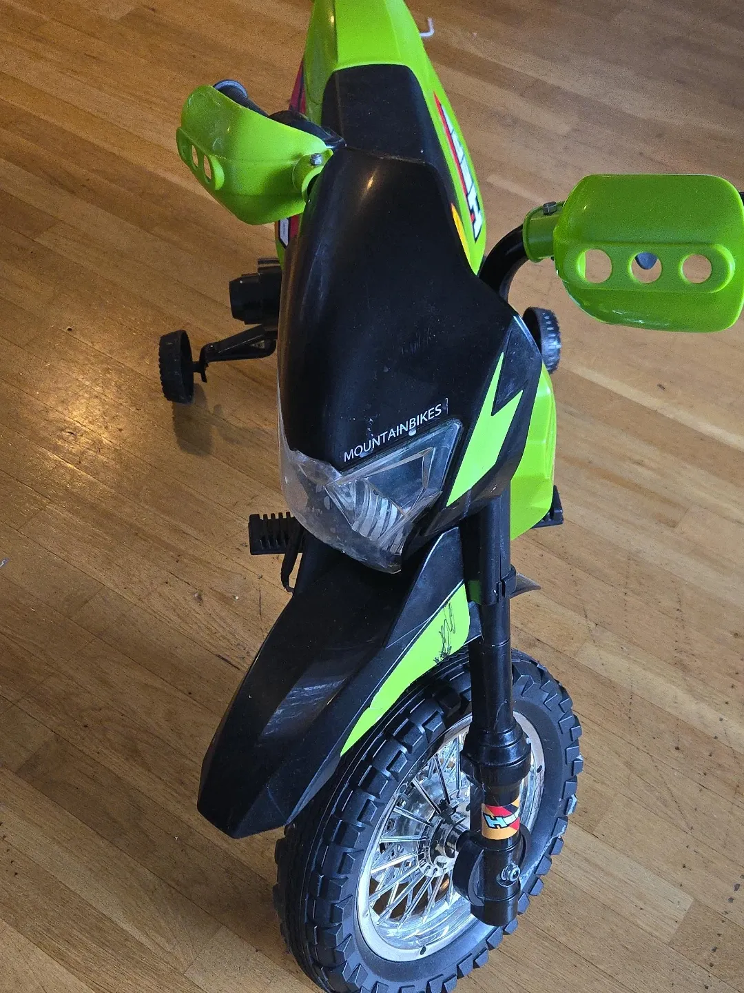 This is a fun green and black ride-on toy motorcycle. It has 'MOUNTAINBIKES' printed on the front. Comes with training wheels for stability. Great for outdoor play! Used only a month indoor.
