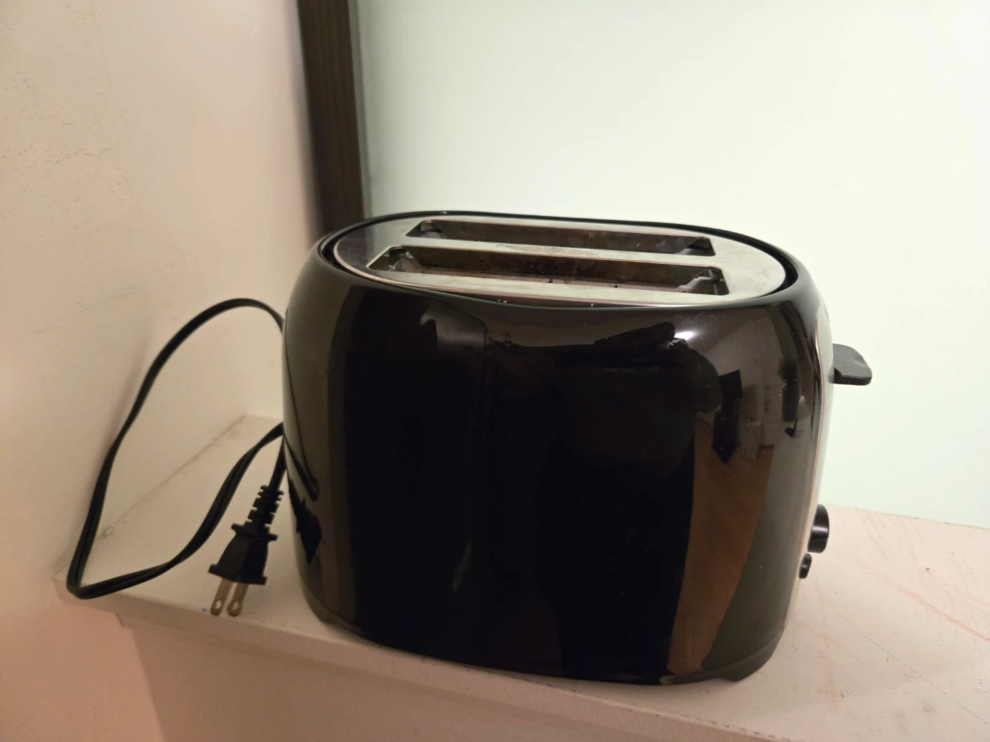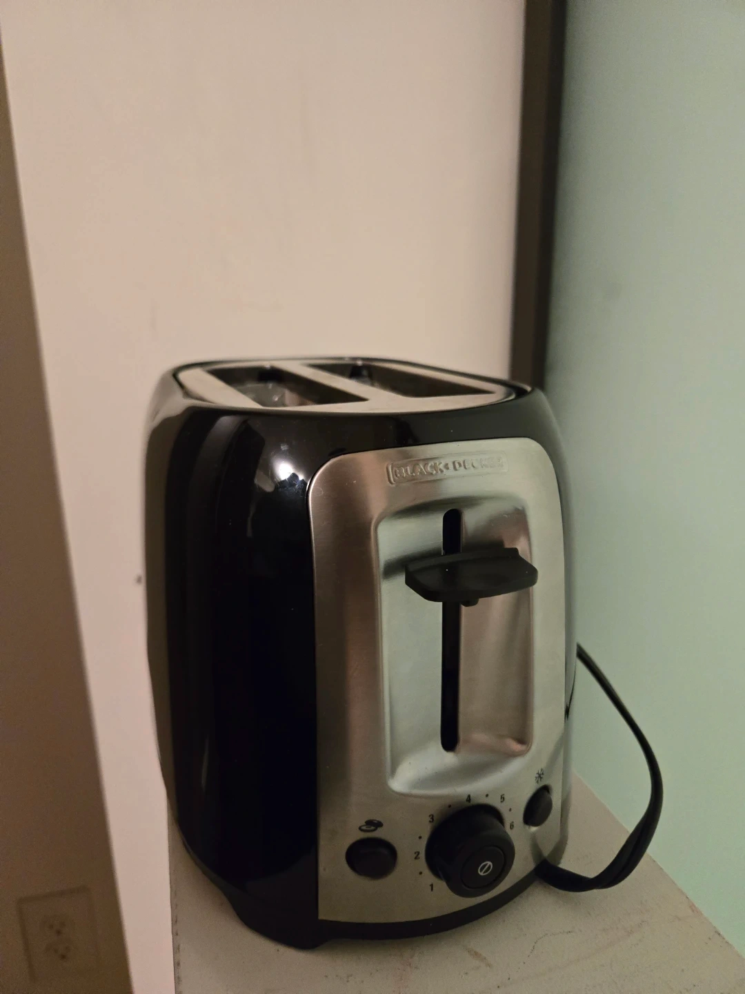 This is a BLACK+DECKER 2-slice toaster. It's black and has a stainless steel accent. Features include cancel, reheat, and defrost settings. It's perfect for making toast or bagels in the morning!